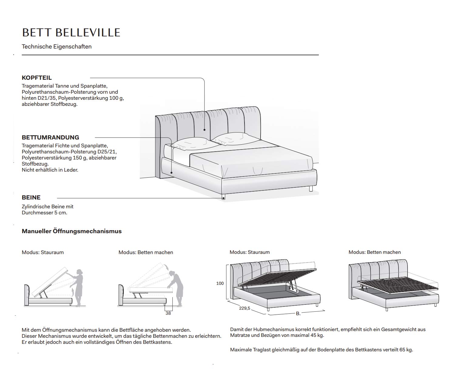 Le prix du lit comprend le sommier à lattes et le mécanisme avec un système d'ouverture double, mais pas le matelas. Il est recommandé que le poids total du matelas et des housses ne dépasse pas 45 kg afin que le mécanisme de levage fonctionne correctement. La charge maximale, qui doit être répartie uniformément sur la plaque de fond du sommier, est de 65 kg.