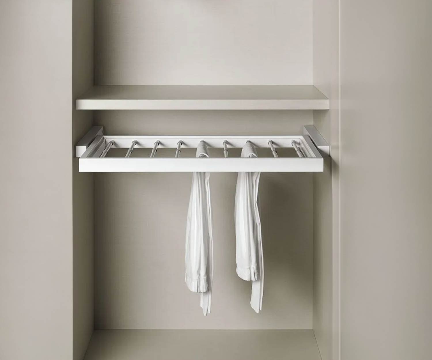 Porte-pantalons Armadi en aluminium pour les armoires à vêtements de Novamobili et Livitalia. Rangement facile et sans plis de toutes sortes de pantalons. Le porte-pantalons se retire facilement et silencieusement grâce à des glissières de haute qualité.