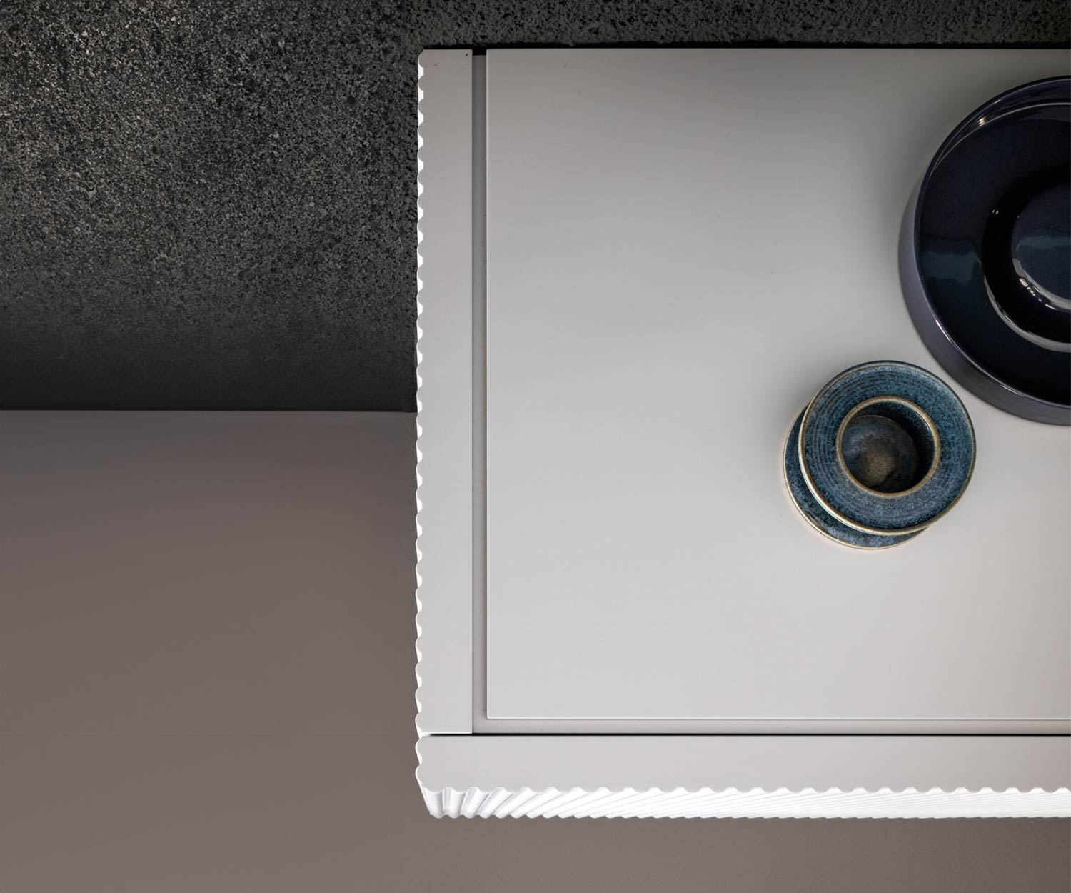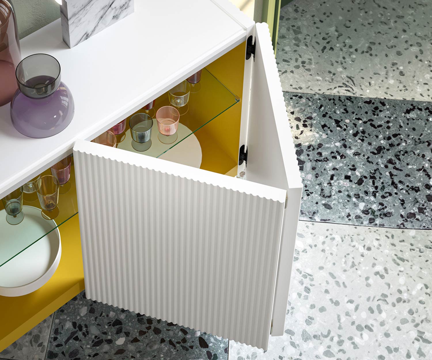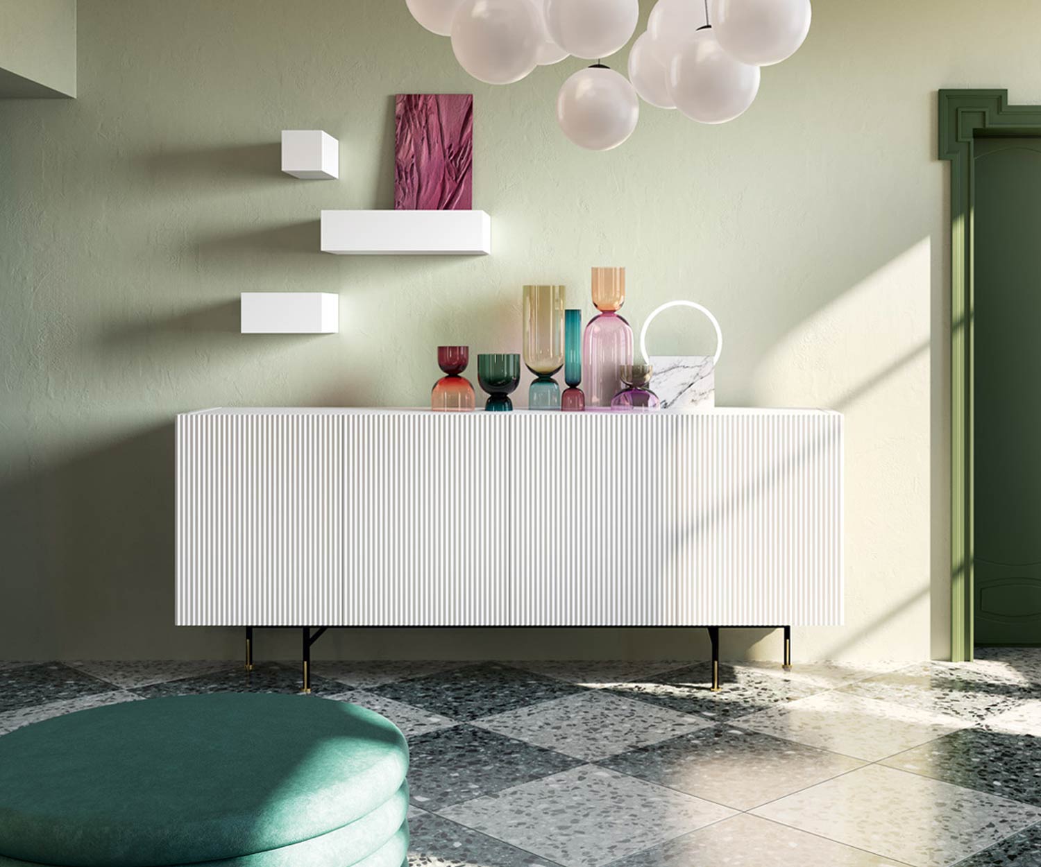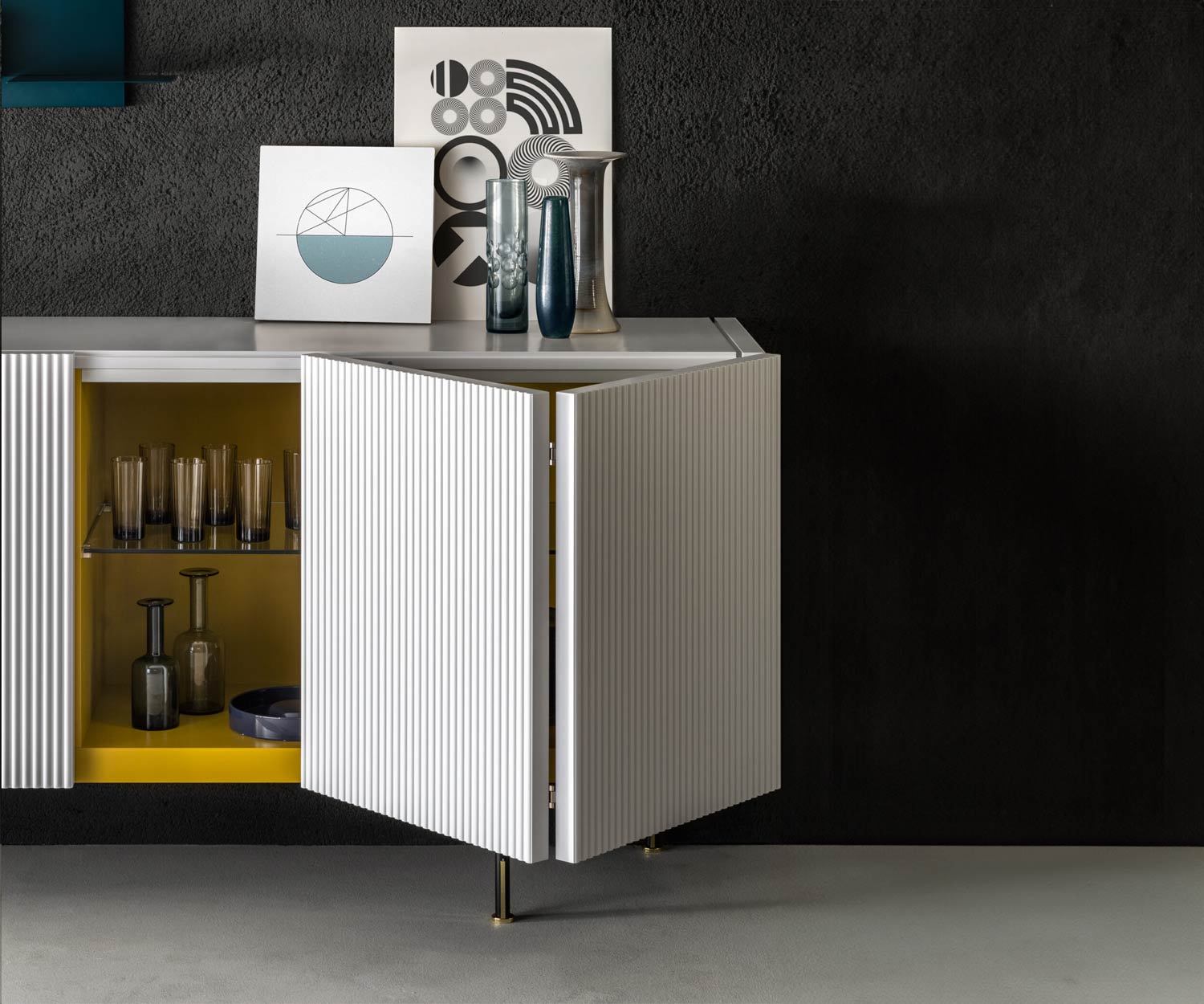 Le corps du sideboard Capo d'Opera Aero est laqué en couleur mate dans le corps intérieur, assorti aux façades et aux côtés extérieurs. Les portes du sideboard sont composées d'un panneau MDF de haute qualité, avec des façades et des côtés extérieurs à motif ondulé vertical.