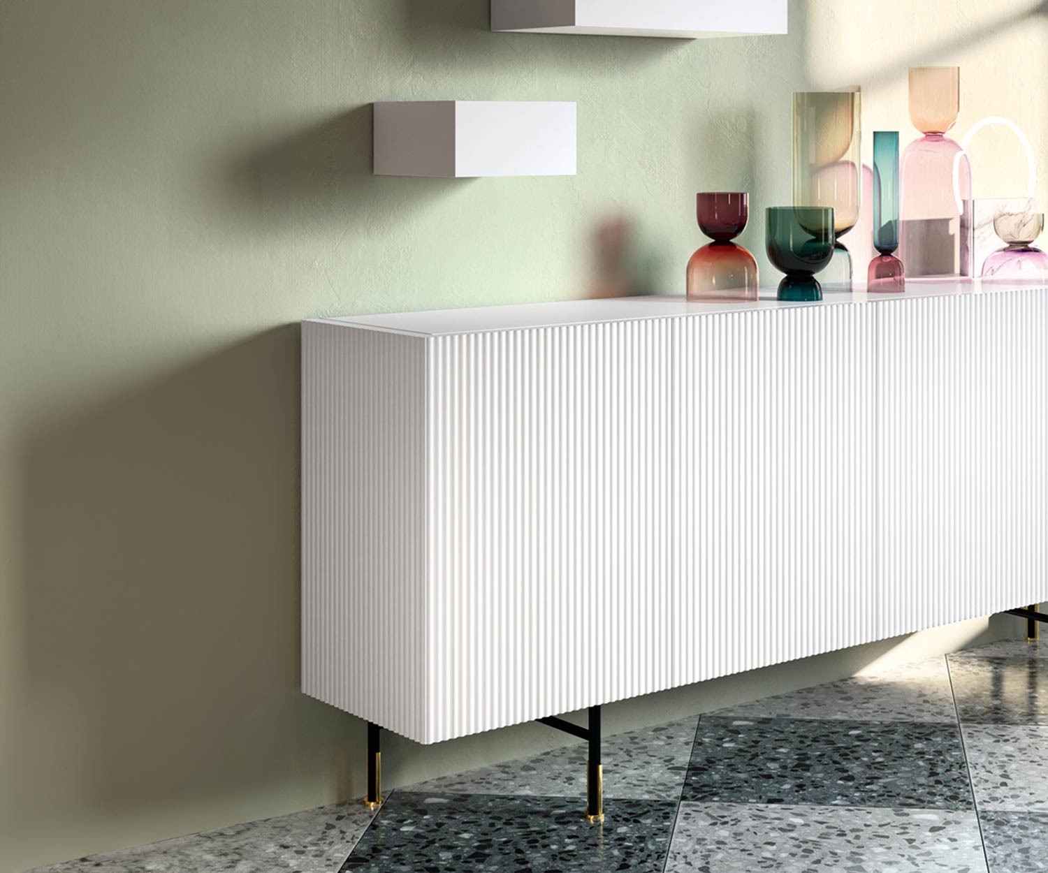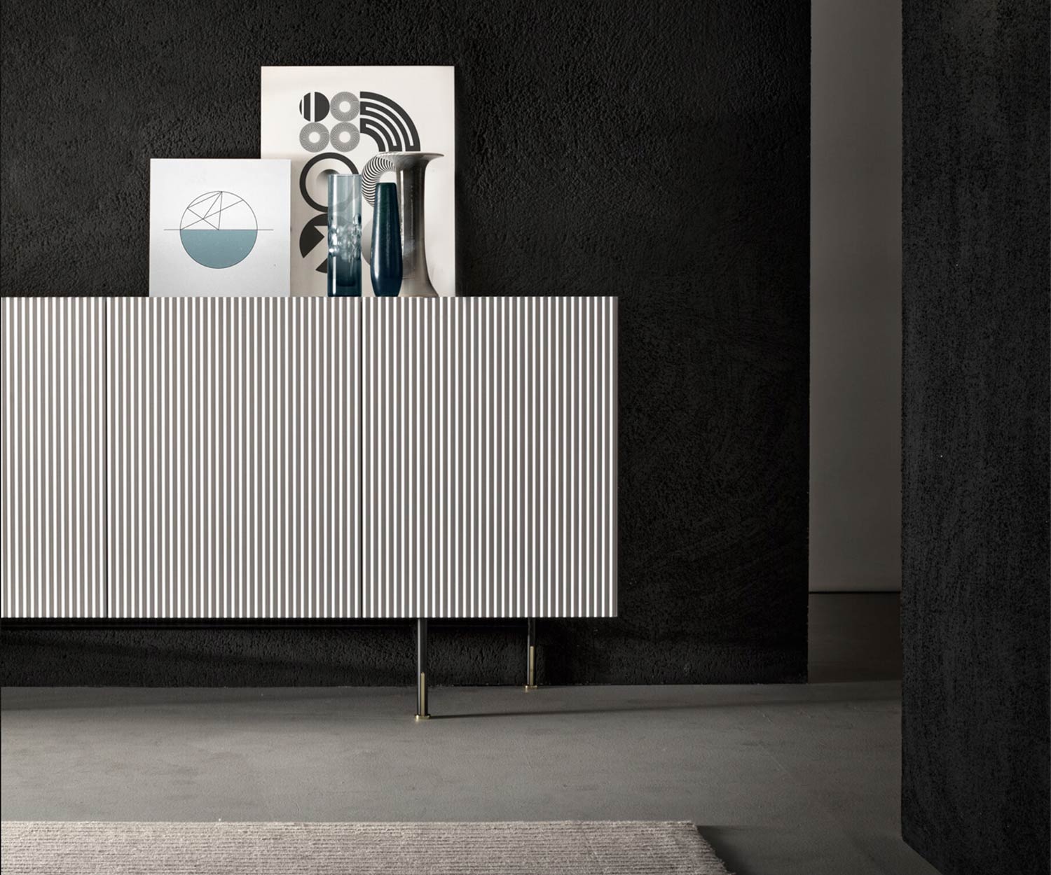 Le corps du sideboard Capo d'Opera Aero est laqué en couleur mate dans le corps intérieur, assorti aux façades et aux côtés extérieurs. Les portes du sideboard sont composées d'un panneau MDF de haute qualité, avec des façades et des côtés extérieurs à motif ondulé vertical.
