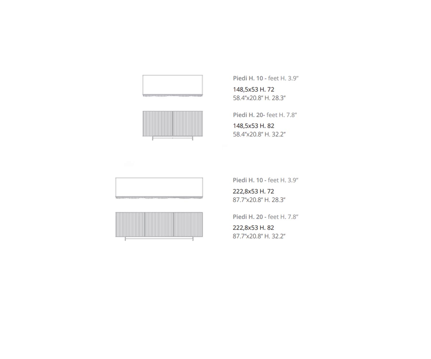En outre, il est possible de choisir entre deux hauteurs de pieds métalliques : H 72 cm (avec pieds H 10 cm) ou H 82 cm (avec pieds H 20 cm).