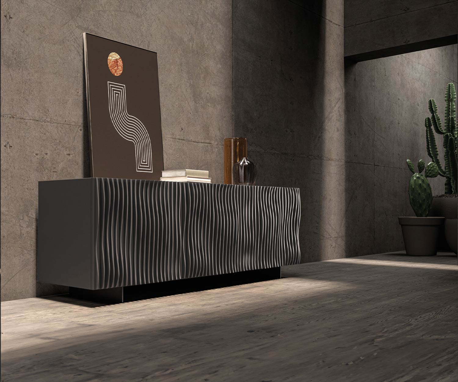 La façade et le corps du sideboard design Ozzio Onda sont disponibles dans les impressionnantes couleurs laquées bronze mat ou gris ardesia mat . Les pieds métalliques sont laqués bronze mat ou graphite mat , assortis à la couleur du corps et de la façade.