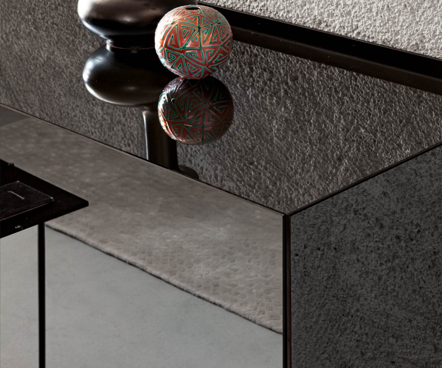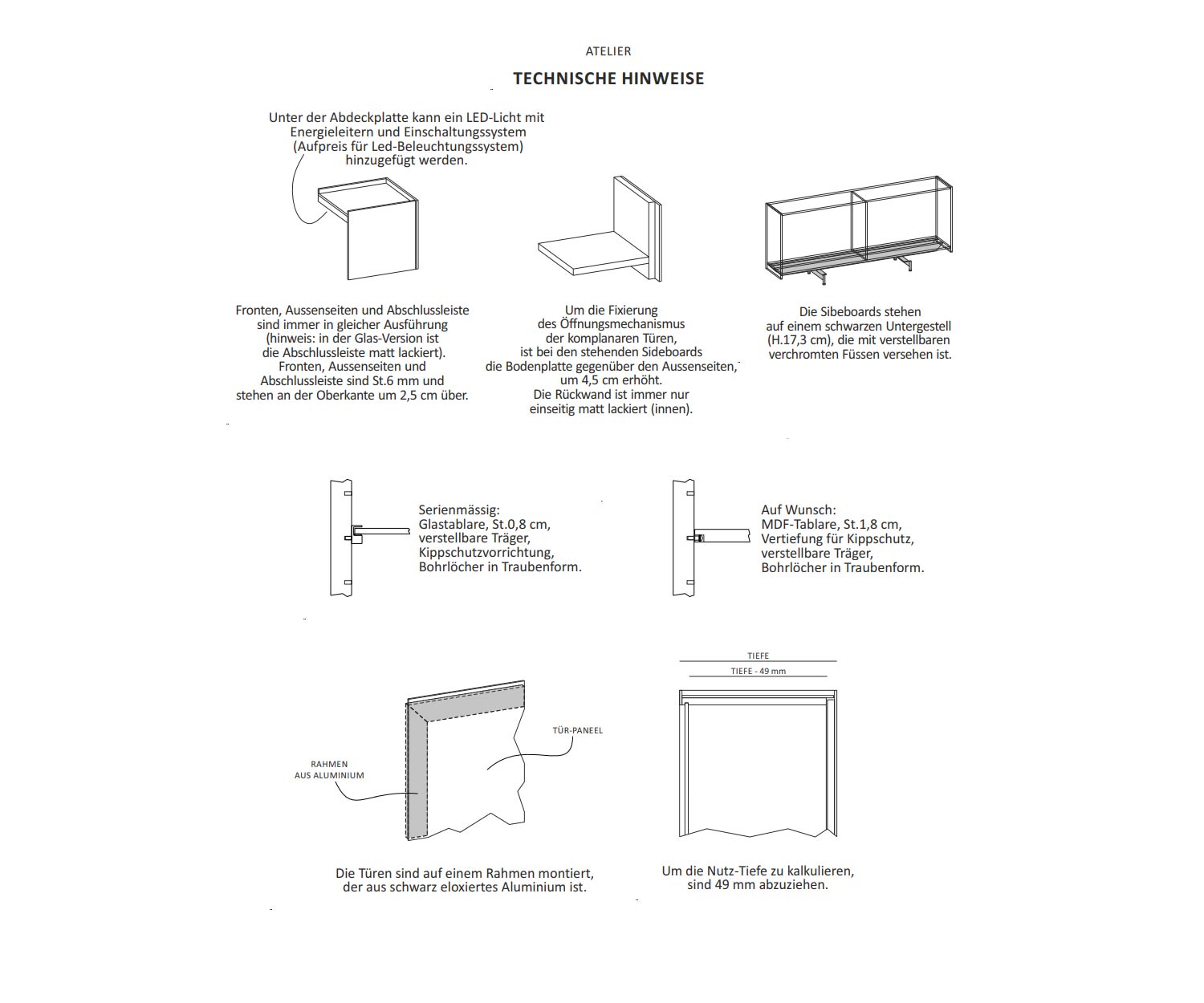 Le corps du sideboard Capo d'Opera Atelier est toujours disponible dans la même finition brillante pour les façades, les côtés extérieurs, la baguette de finition et le plateau de finition. Pour la version en verre miroir Stop Sol, la baguette de finition est laquée mate. Le panneau de porte est monté sur un cadre en aluminium anodisé noir. et semble ainsi plus stable.