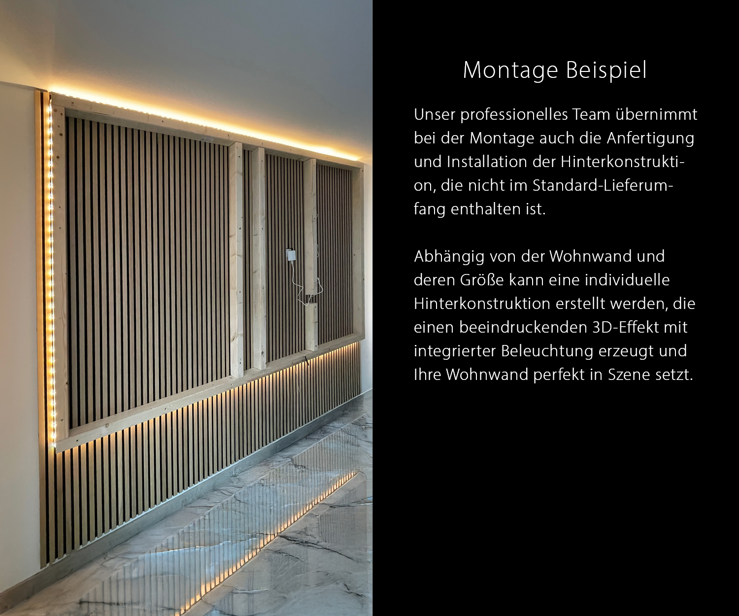 Ce modèle est également fabriqué individuellement pour vous et adapté à vos souhaits. Nous nous ferons un plaisir de vous aider avec une visualisation 3D sur mesure, afin de vous aider à planifier votre mur d'habitation. de manière optimale. Pour une réalisation directe, nous recommandons notre package de planification et d'offre 3D.