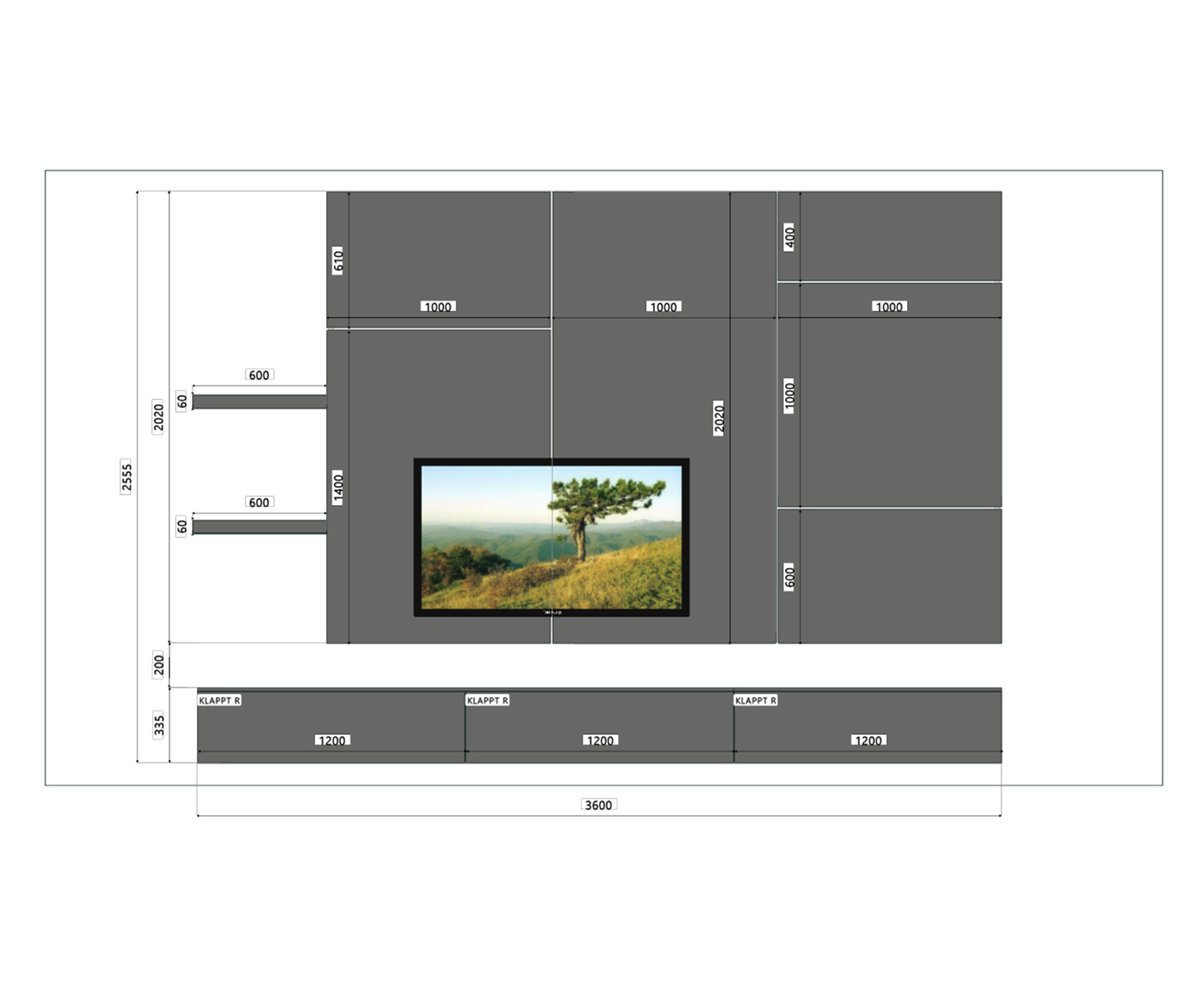 • Panneau TV : Panneau large (300 cm), parfait pour les téléviseurs de plus de 65 pouces.