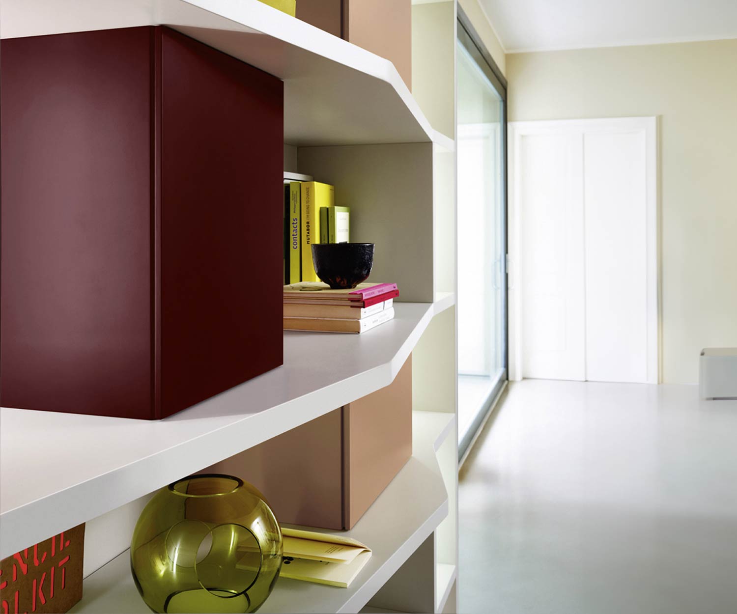 Sur l'illustration, la bibliothèque est en blanc mat (similaire à RAL9016). Les boîtes fermées et les séparateurs sont laqués. D'autres combinaisons de couleurs sont également possibles en option sur demande.