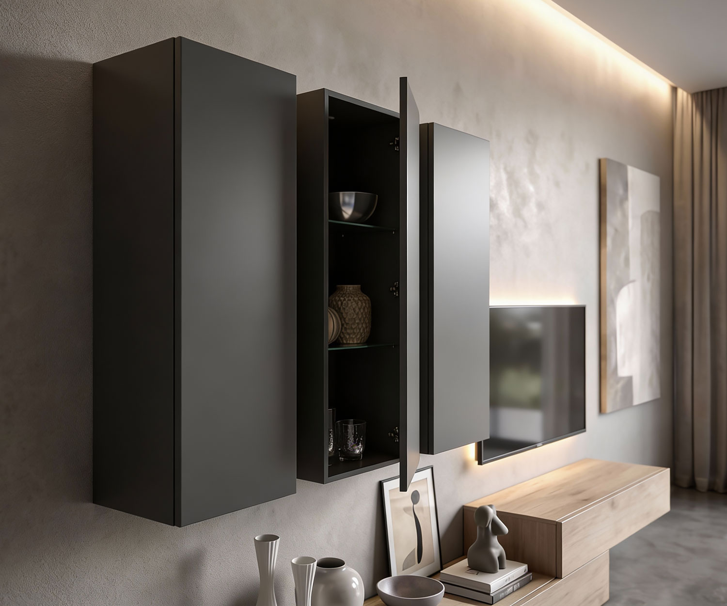 Les meubles sont sans poignée et s'ouvrent et se ferment par une légère pression sur la façade. Derrière les portes des armoires suspendues se trouvent deux étagères en verre. Selon vos souhaits, les différents éléments peuvent également être disposés dans un autre ordre. Sur demande, nous pouvons également adapter le meuble-paroi à vos besoins.