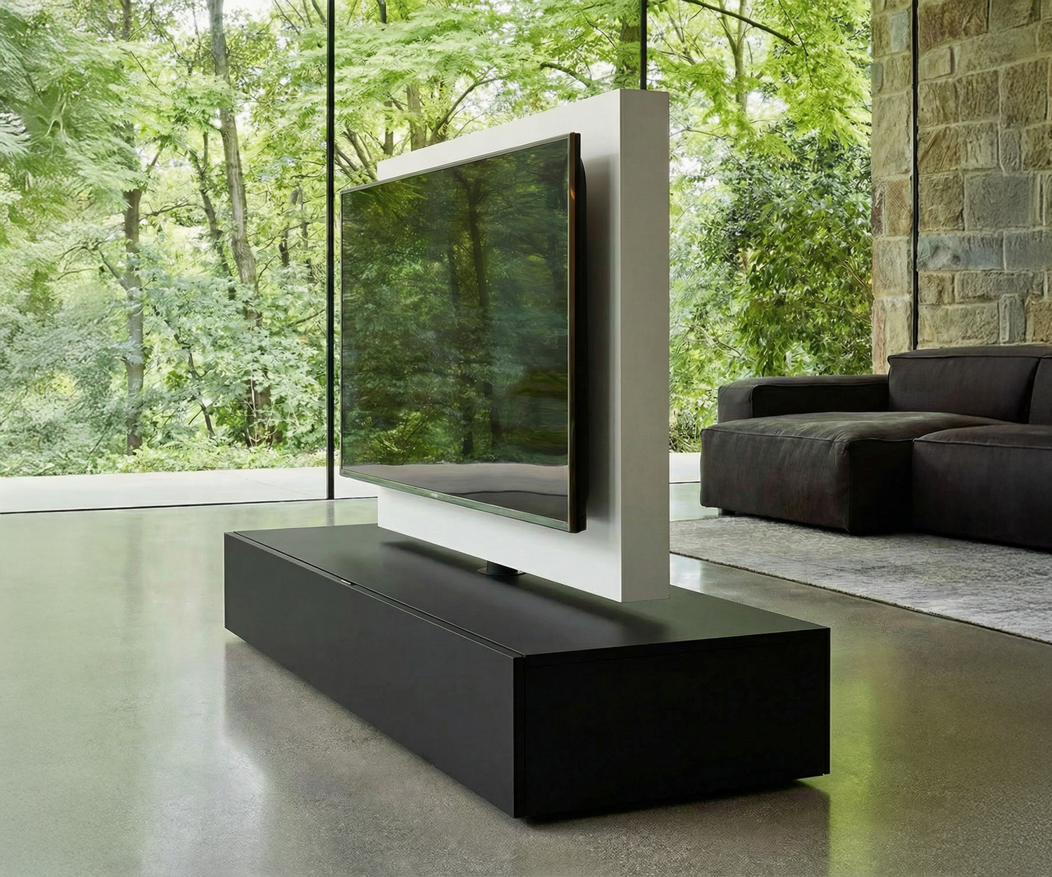 La particularité de ce meuble design : il est entièrement autonome et rotatif. La colonne TV peut pivoter à 360°, vous permettant de regarder la télévision sous tous les angles – que ce soit depuis le canapé ou la table à manger.