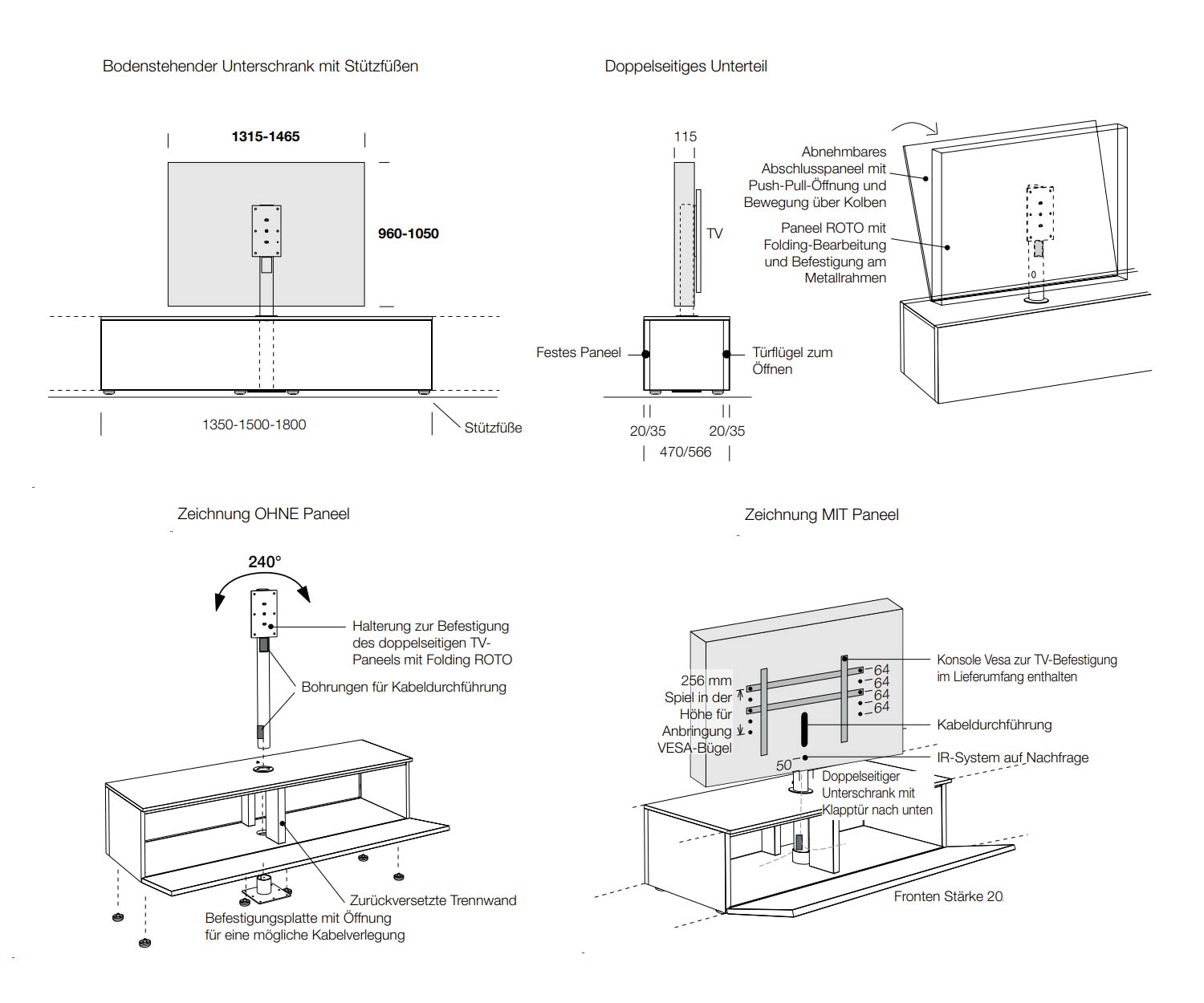 Le panneau TV peut être ouvert à l'arrière afin de pouvoir poser tous les câbles de manière ordonnée et de visser la télévision sur le panneau. Le support TV pour le montage de la télévision sur le panneau n'est pas compris dans la livraison et doit être commandé séparément en fonction du modèle de télévision. Nous recommandons le support TV HAMA (modèle : 118128) ; il convient très bien à de nombreux modèles de téléviseurs.
