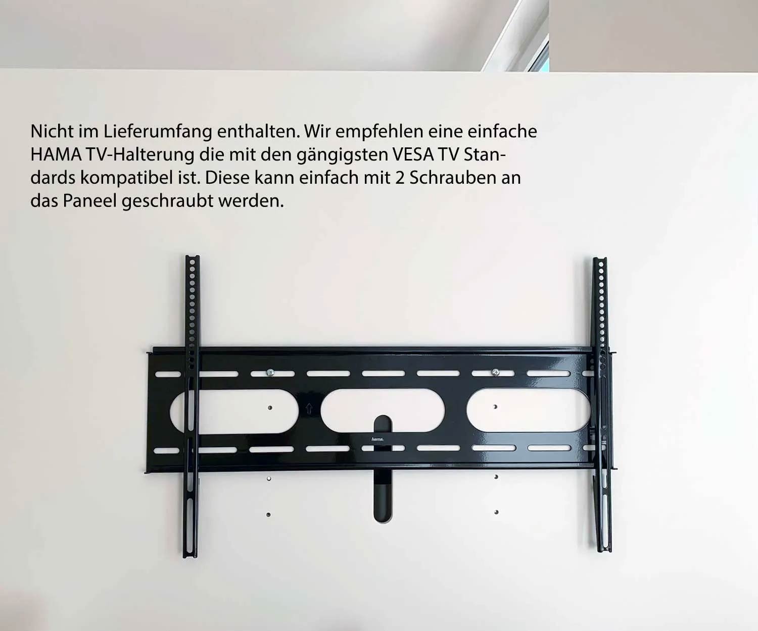 Auch für zusätzlichen Komfort ist gesorgt: Auf Wunsch lässt sich unter dem Fernseher eine Soundbar integrieren. Besitzt diese eine Wandhalterung, kann sie direkt mit Holzschrauben befestigt werden. Alternativ ist auch eine Montage über eine Erweiterung an der TV-Halterung möglich – ganz ohne Bohren. Besonders empfehlenswert ist hierfür das Modell HAMA 00108746.