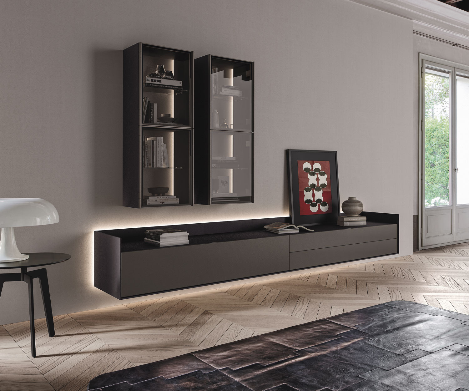 La vitrine en verre moderne suspendue Livitalia Design Scrigno est fabriquée pour vous en Italie, uniquement sur commande. La vitrine en verre convainc par ses grandes portes en verre avec un cadre étroit. La vitrine est disponible en différentes largeurs de modules (voir croquis), qui peuvent être combinés entre eux pour former une variante de n'importe quelle largeur (comme illustré). Jusqu'à une largeur de 300 cm, il est possible d'utiliser un plateau de recouvrement continu. Les portes disposent de charnières à 180° qui permettent un accès aisé à l'intérieur.