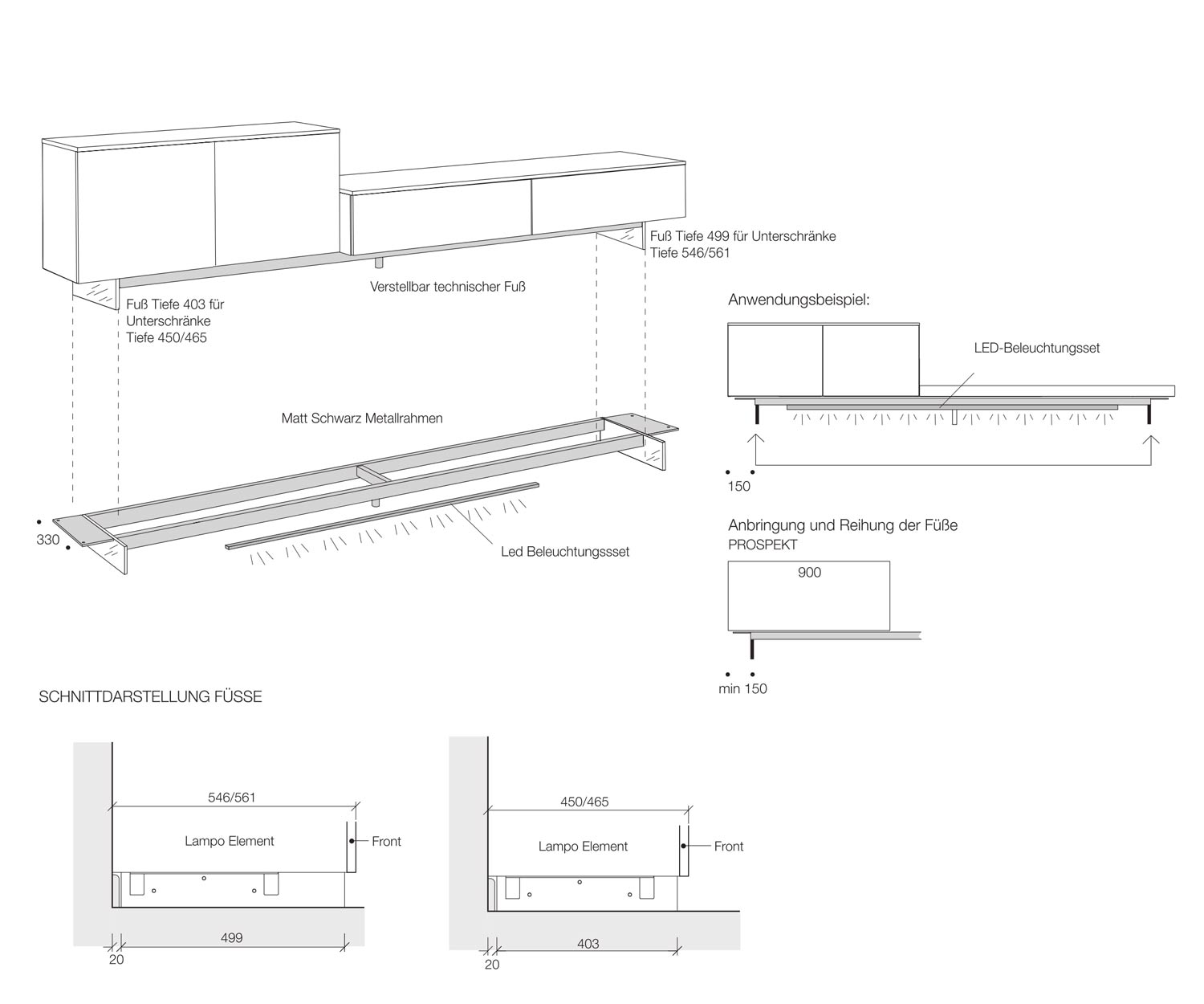 Le socle dispose d'un cadre métallique noir qui est vissé sur le fond inférieur du lowboard. Avec une profondeur de 39,7 cm, le socle est moins profond que le lowboard et est donc à peine visible. Au milieu se trouve un troisième pied, réglable en hauteur. Celui-ci empêche le fléchissement en cas de charge importante. Un éclairage LED (3000K) peut être commandé en option sous le socle.