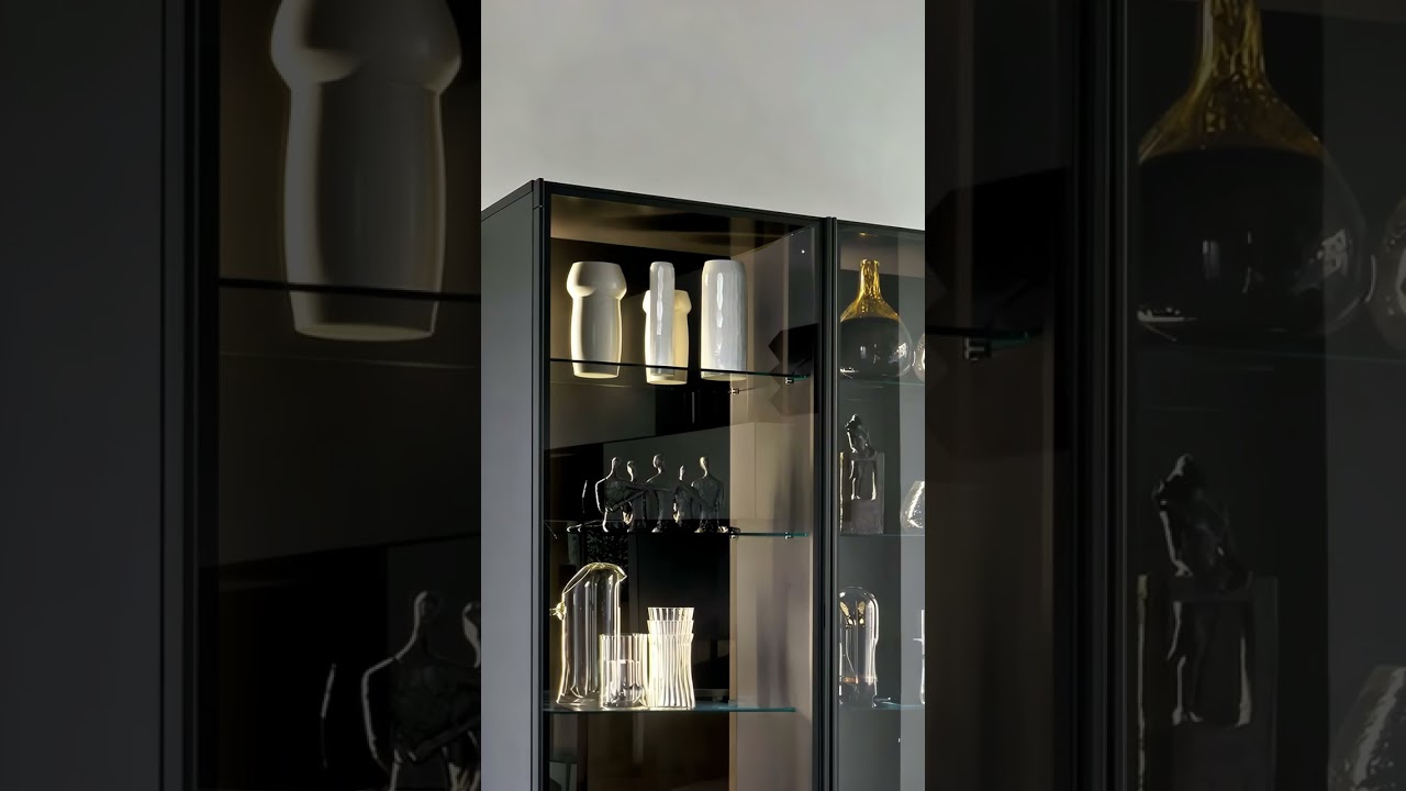 La vitrine en verre design Scrigno est disponible dans les coloris noir mat (similaire à RAL9011), brun foncé mat (similaire à RAL8019) ou gris foncé mat (similaire à RAL7043).