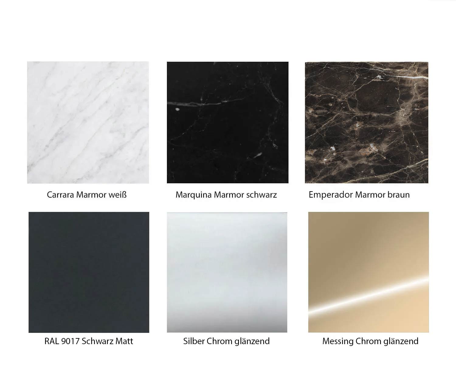 Le plateau de la table basse Twig est disponible en 5 finitions : marbre blanc de Carrare, marbre noir de Marquina, marbre brun d'Emperador, marbre doré de Calacatta ou marbre noir doré. Le piètement est disponible en RAL 9017 noir mat, chrome argenté, chrome noir ou laiton doré brillant. Pour votre table en marbre, nous vous proposons deux vitrifications différentes : Une fois une vitrification X-Stone et ensuite une couche de polyester.
