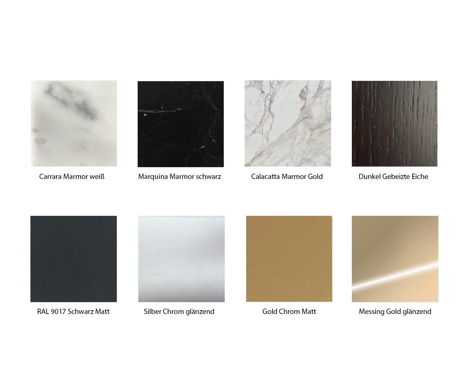 Le plateau de table est disponible en finition chêne foncé et le marbre en blanc Carrara, noir Marquinia, brun Emperador, or Calacatta ou Black & Gold. Les pieds du piètement sont disponibles en noir mat, blanc mat, chrome brillant, chrome noir brillant, or mat ou laiton .