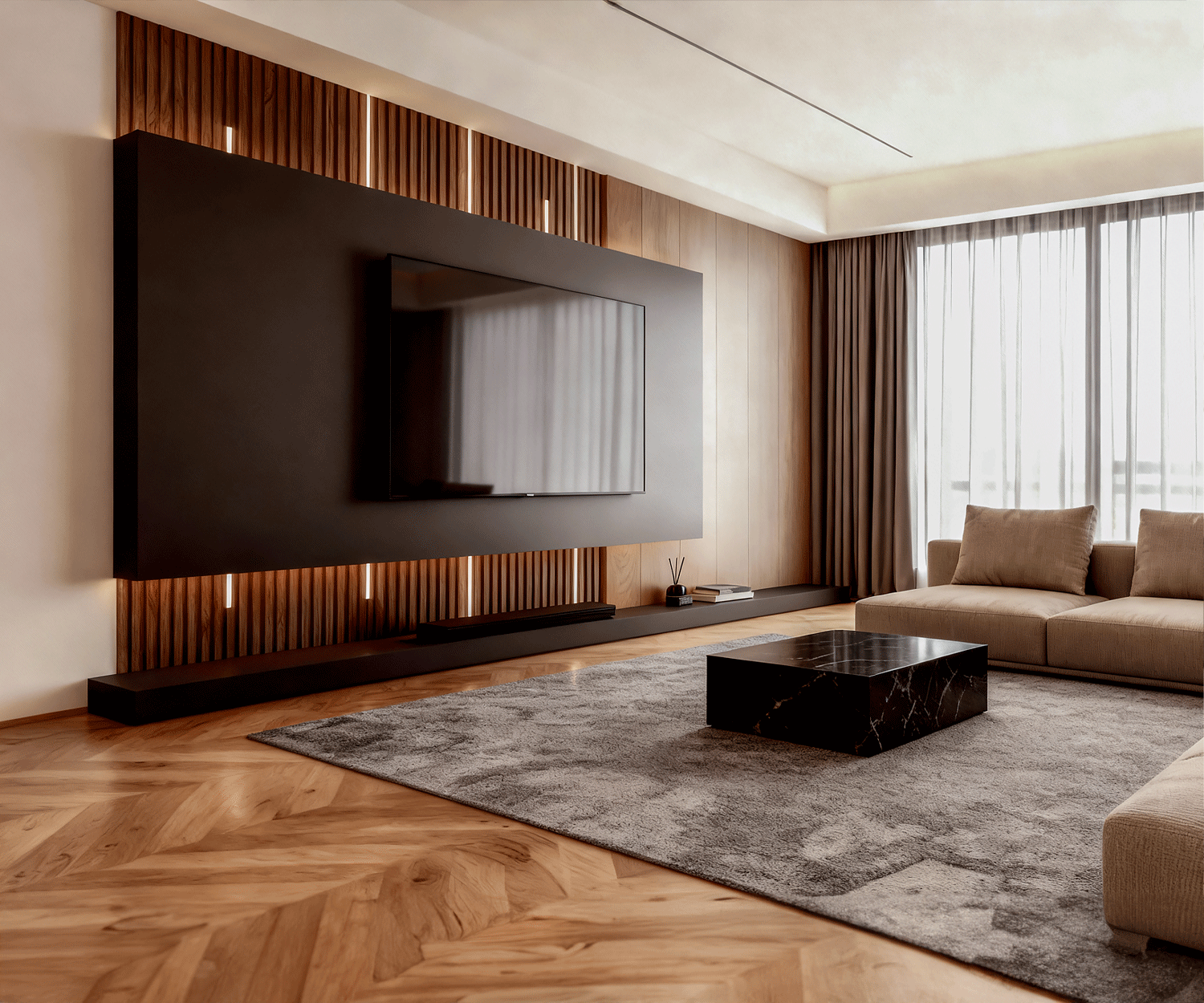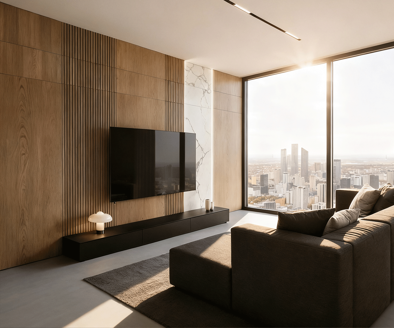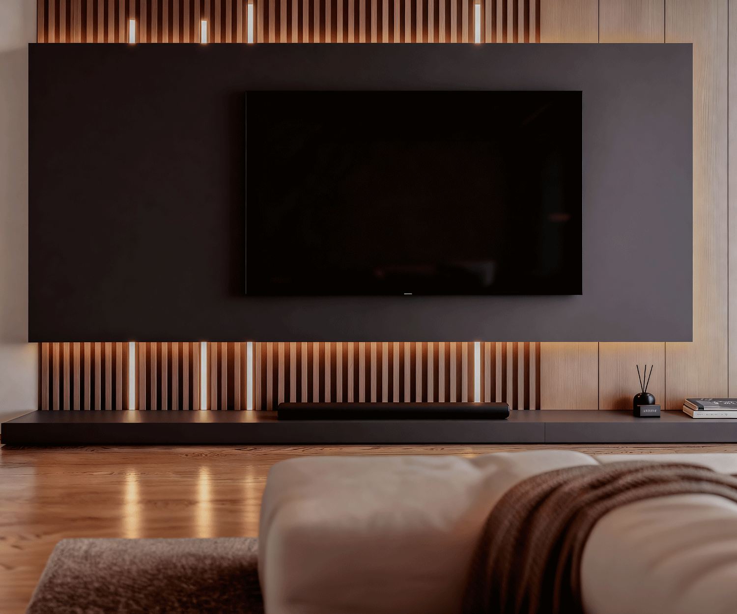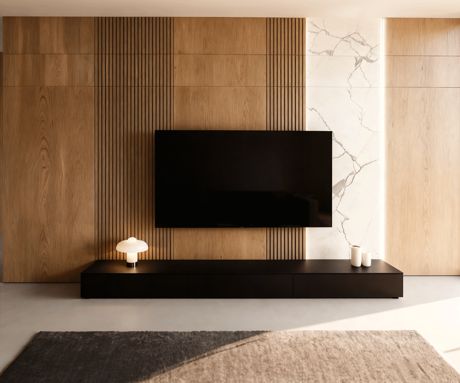 Panneaux acoustiques en bois avec éclairage LED et panneau TV laqué mat avec TV-board