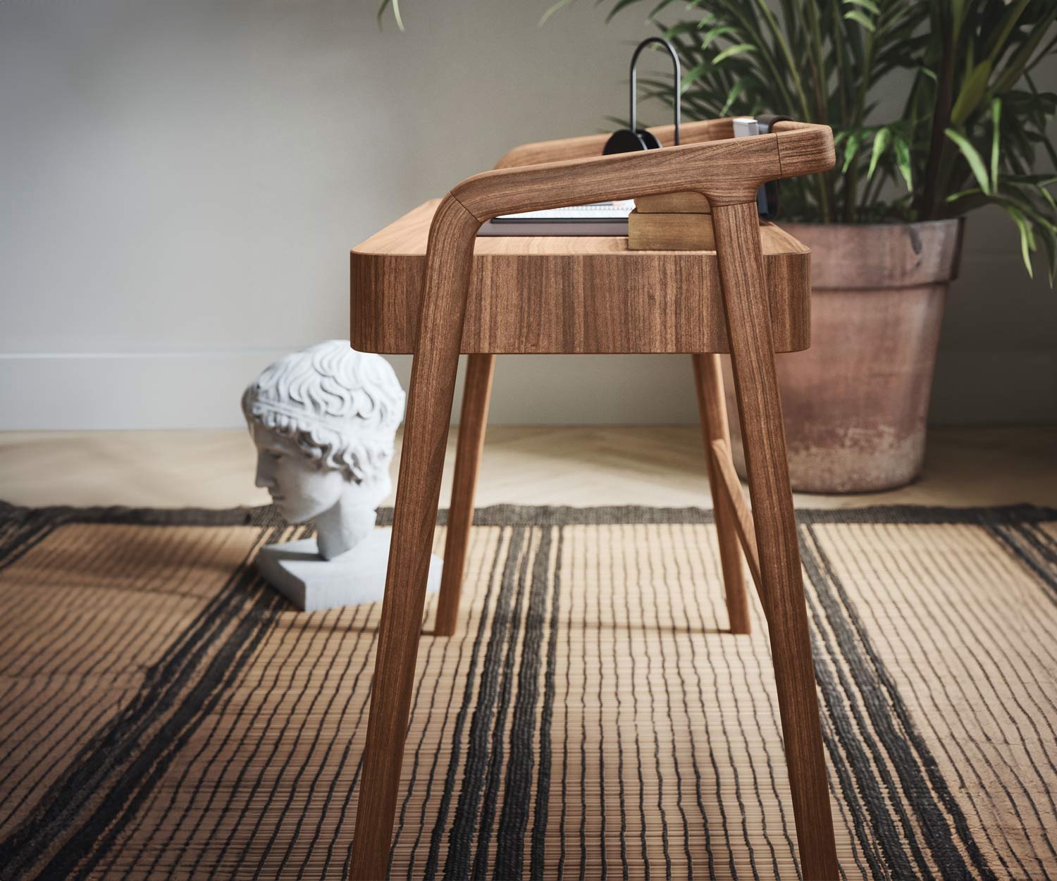 Magnifique bureau design en noyer de Novamobili. Le bureau Knot est fabriqué pour vous en Italie, uniquement sur commande. Le design nordique léger se distingue par une structure en bois déformée et rectiligne