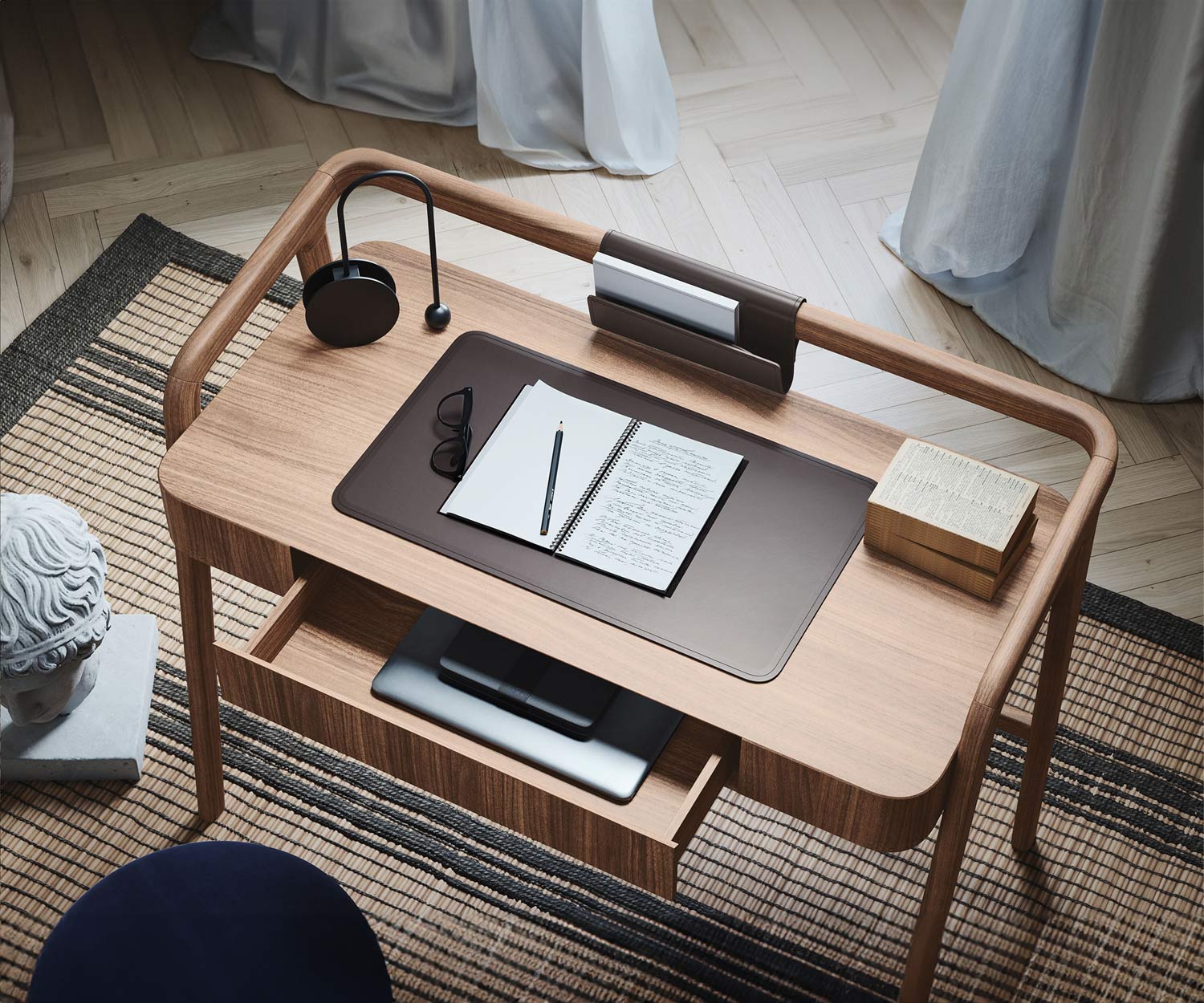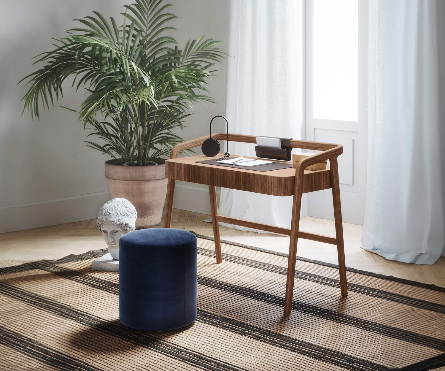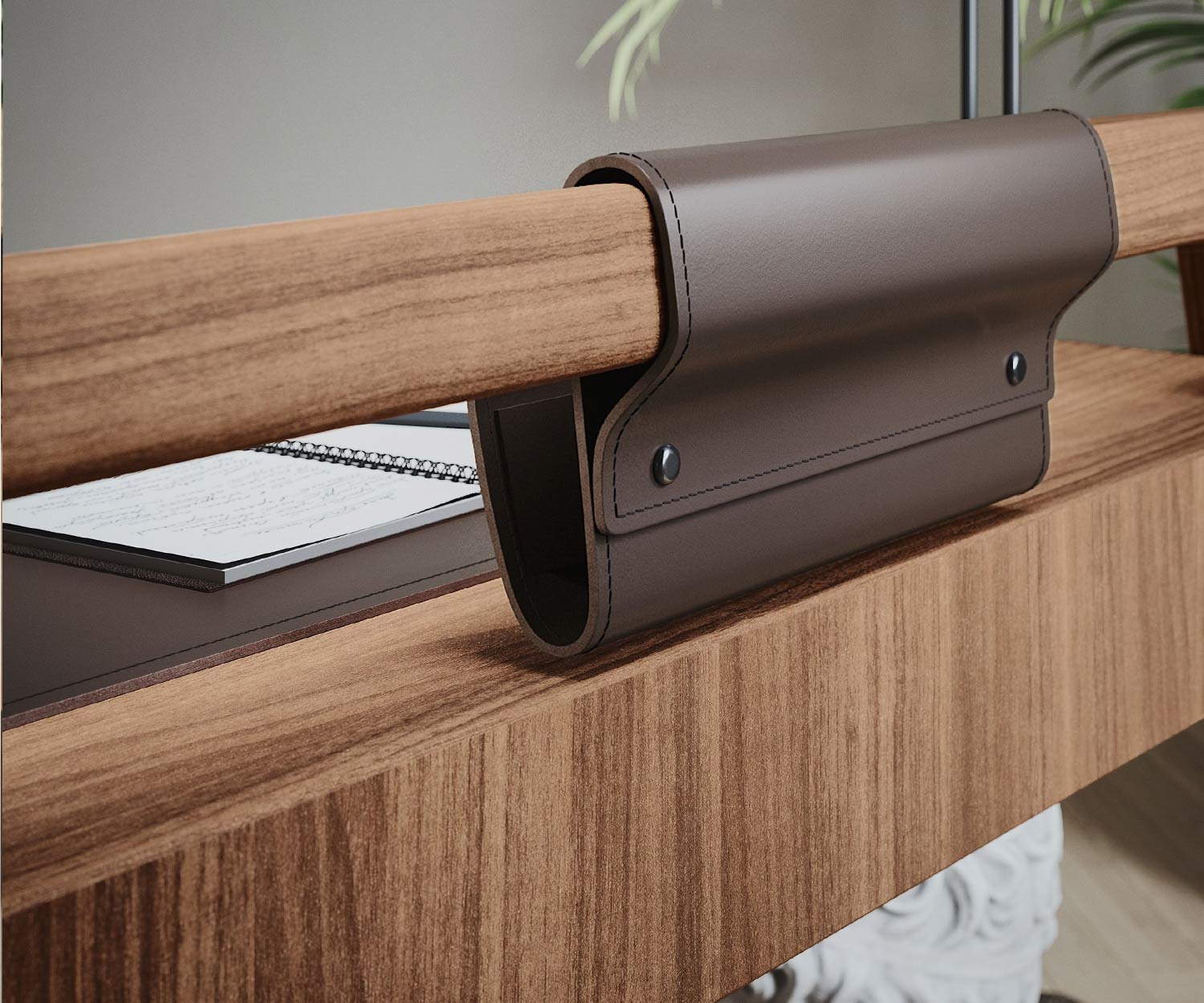Le bureau Knot est disponible en noyer Canaletto N03 . Les accessoires de bureau sont en cuir lisse avec une finition marron foncé.