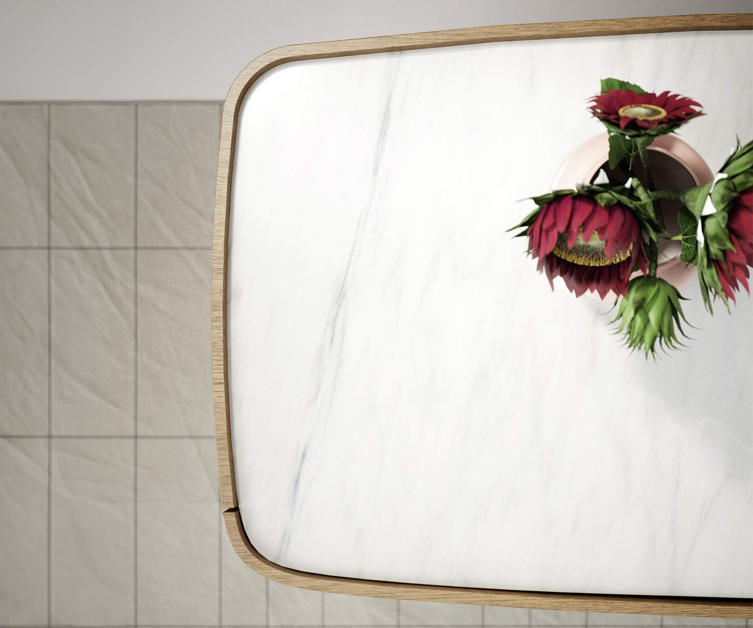 Le corps et les façades sont fabriqués en panneaux de particules arrondis de 19 mm d'épaisseur. La plaque de recouvrement en option est en marbre de Carrare, célèbre dans le monde entier.