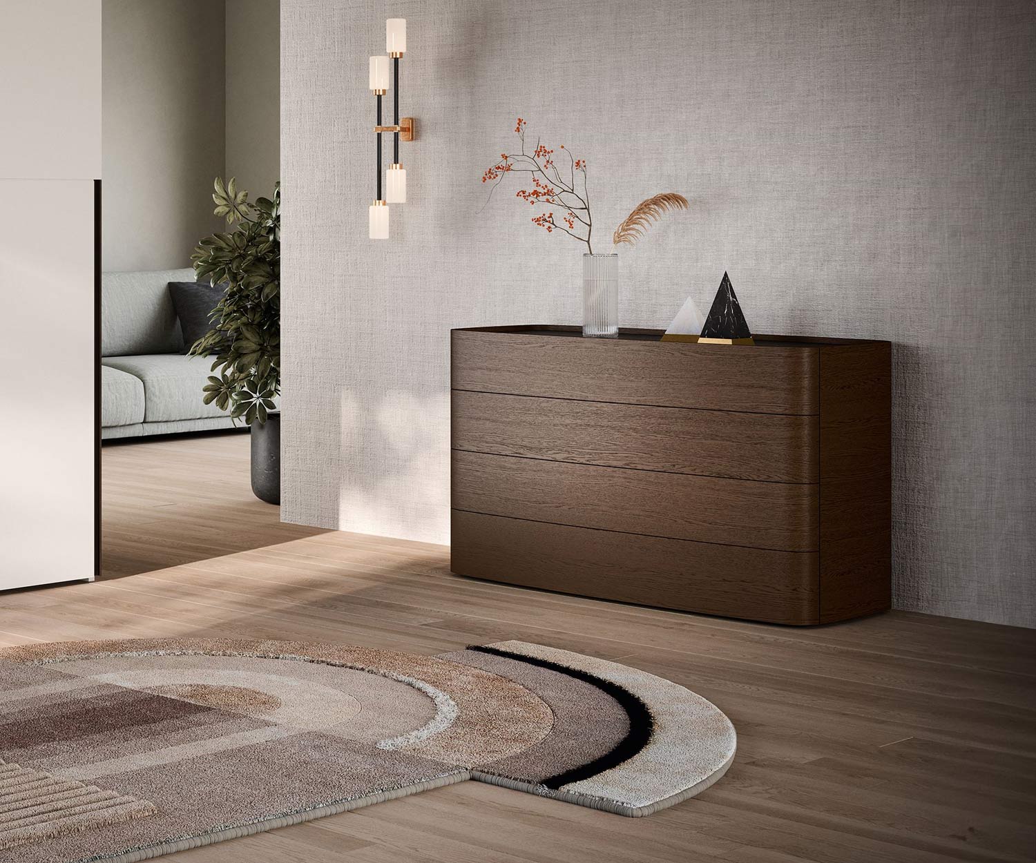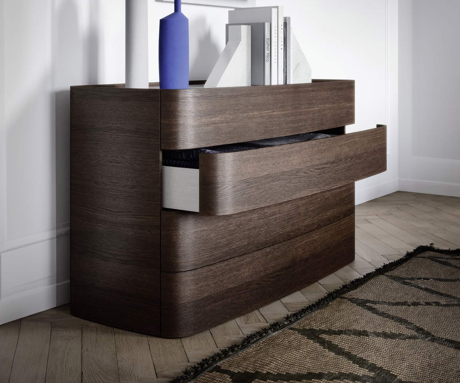 La commode design de chambre à coucher Norman est produite par le fabricant Novamobili en Italie. Les coins arrondis et le placage en chêne naturel sont une caractéristique particulière du design. En option, la commode est également disponible avec un plateau de 12 mm d'épaisseur en marbre de Carrare, célèbre dans le monde entier.