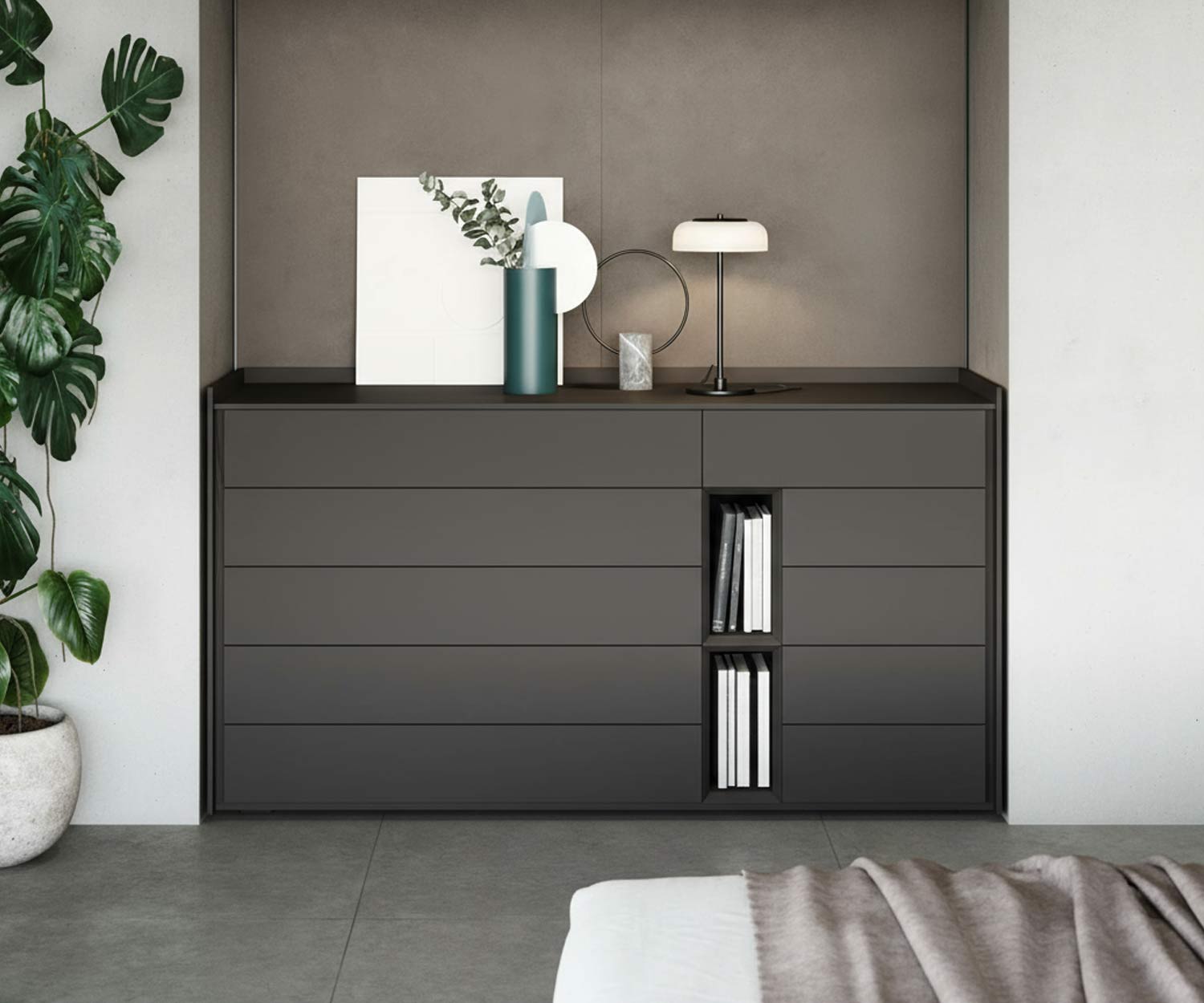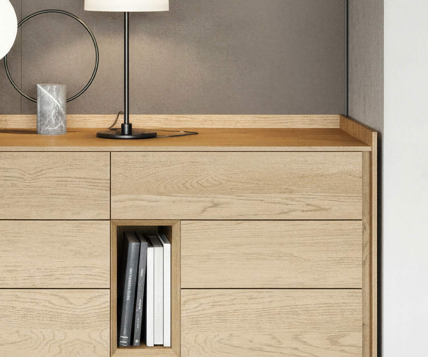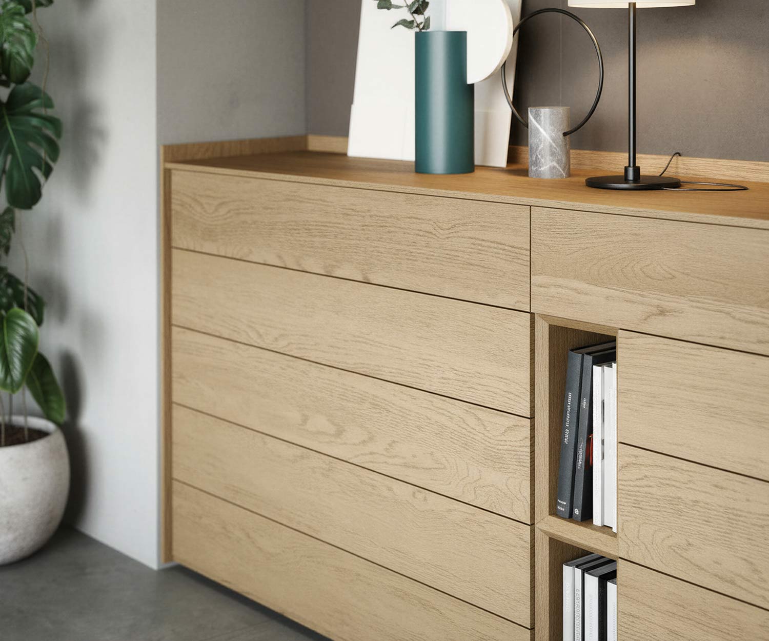 La combinaison de tiroirs fermés et d'éléments ouverts crée un jeu passionnant d'ordre et de légèreté. Il en résulte un concept de mobilier moderne qui allie harmonieusement design et fonctionnalité.
