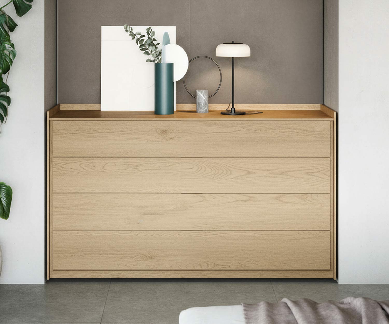 La commode Sly de Novamobili est représentée ci-dessus dans le coloris chêne Rovere Chiaro N04 plaqué bois.
