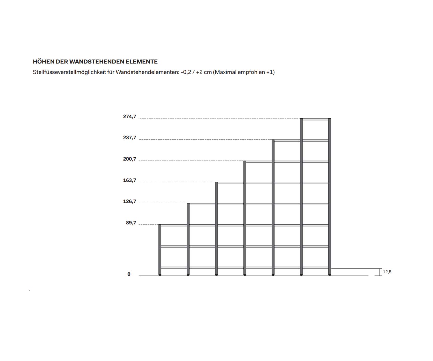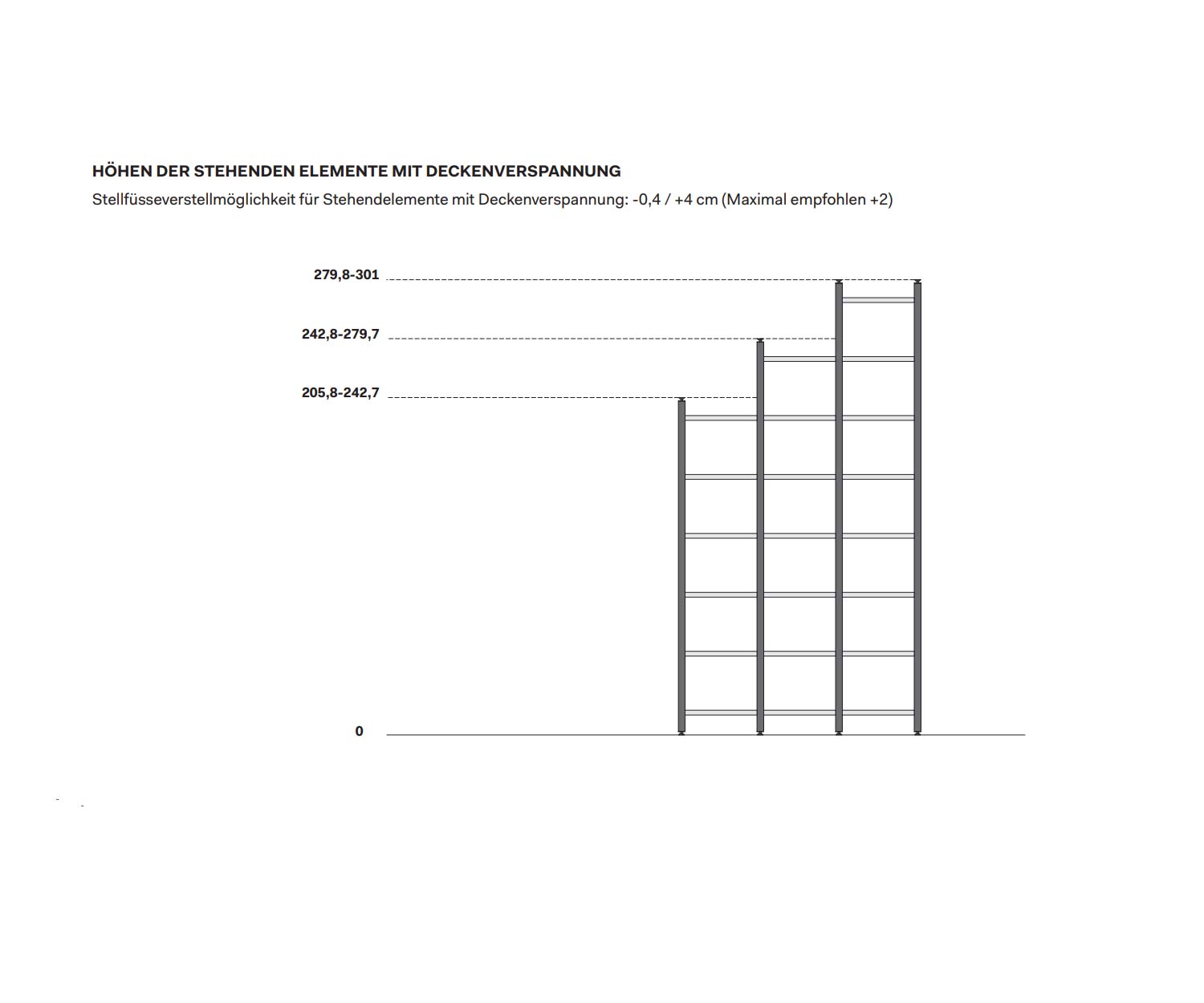 Les hauteurs suivantes sont possibles : 93,7 - 132,7 - 171,7 - 210,7 - 249,7 - 288,7 cm