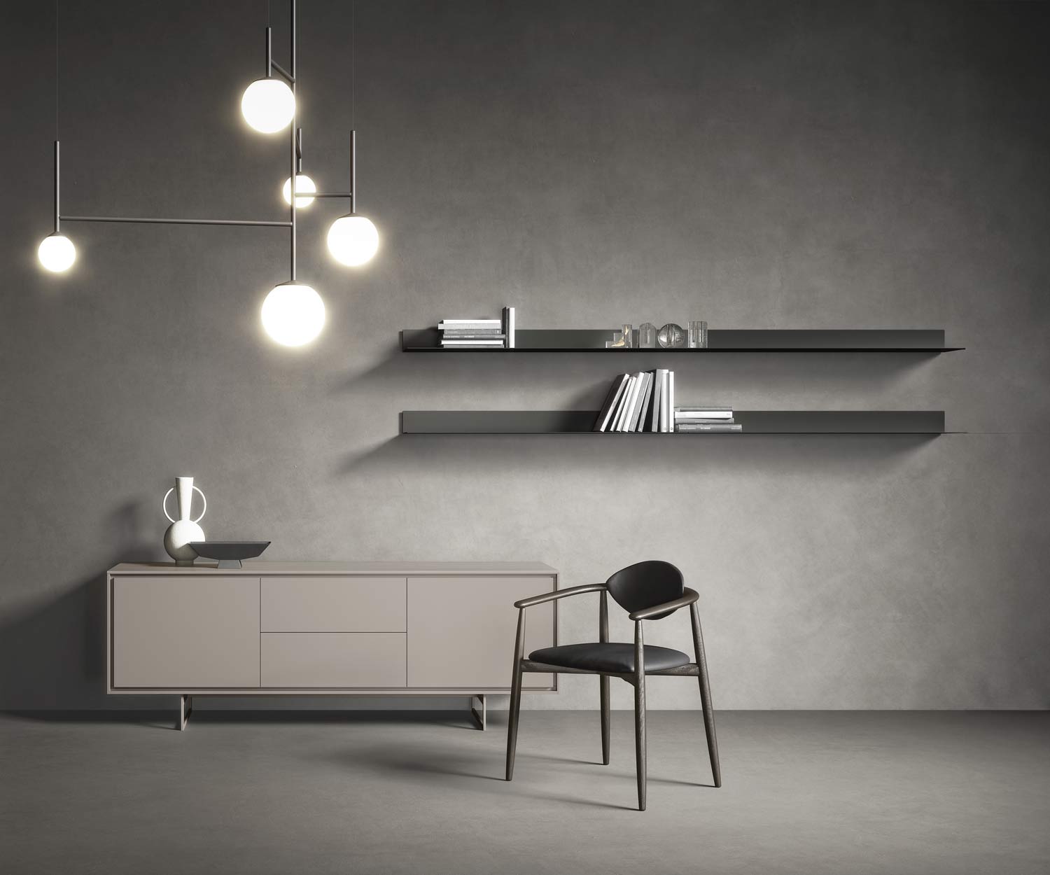 Étagère murale design, moderne et particulièrement plate en métal laqué. L'étagère en métal de 2 mm d'épaisseur a une suspension murale invisible et peut être commandée au choix avec ou sans éclairage LED. L'étagère murale Ellie est uniquement fabriquée sur commande à Novamobili en Italie.