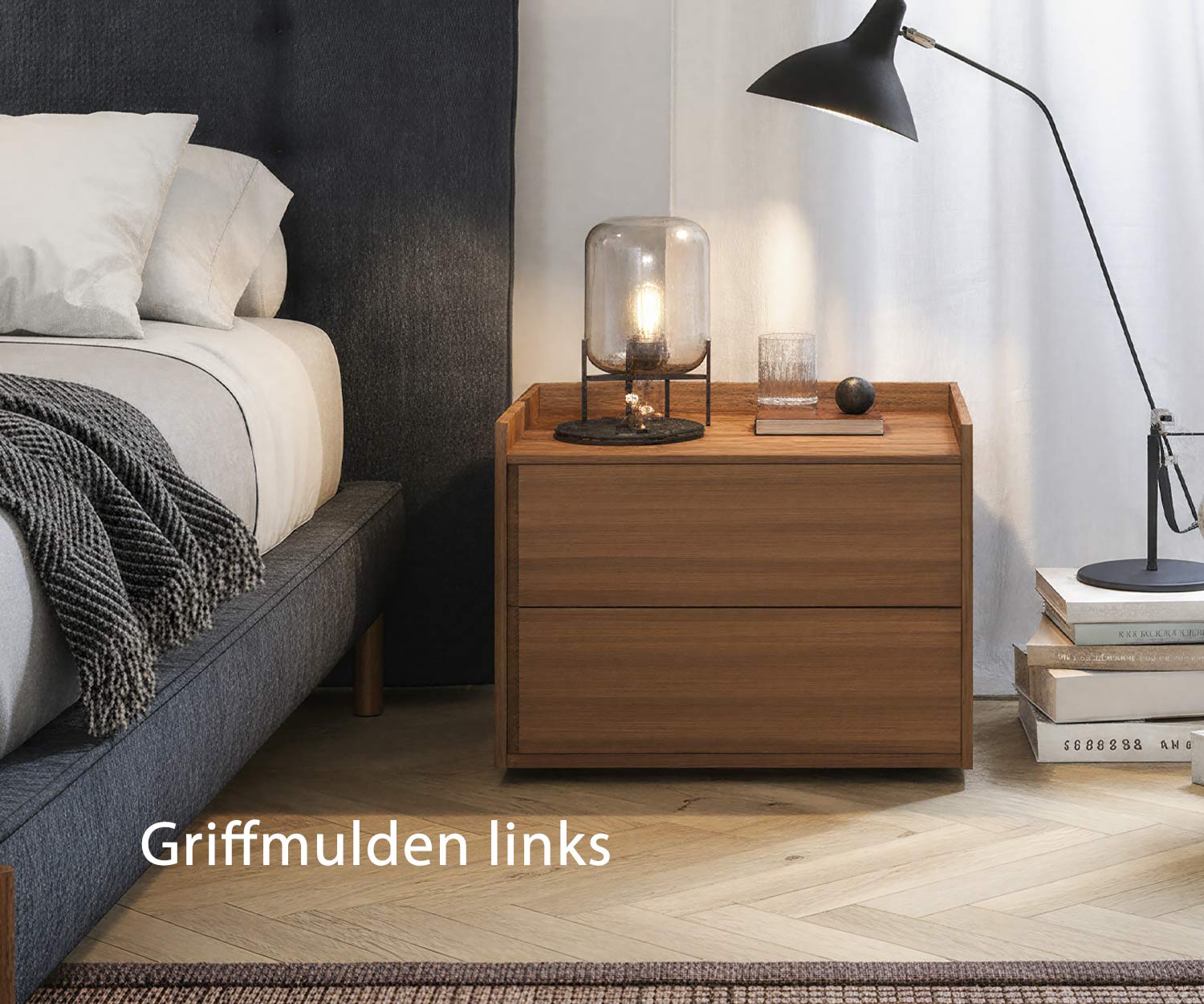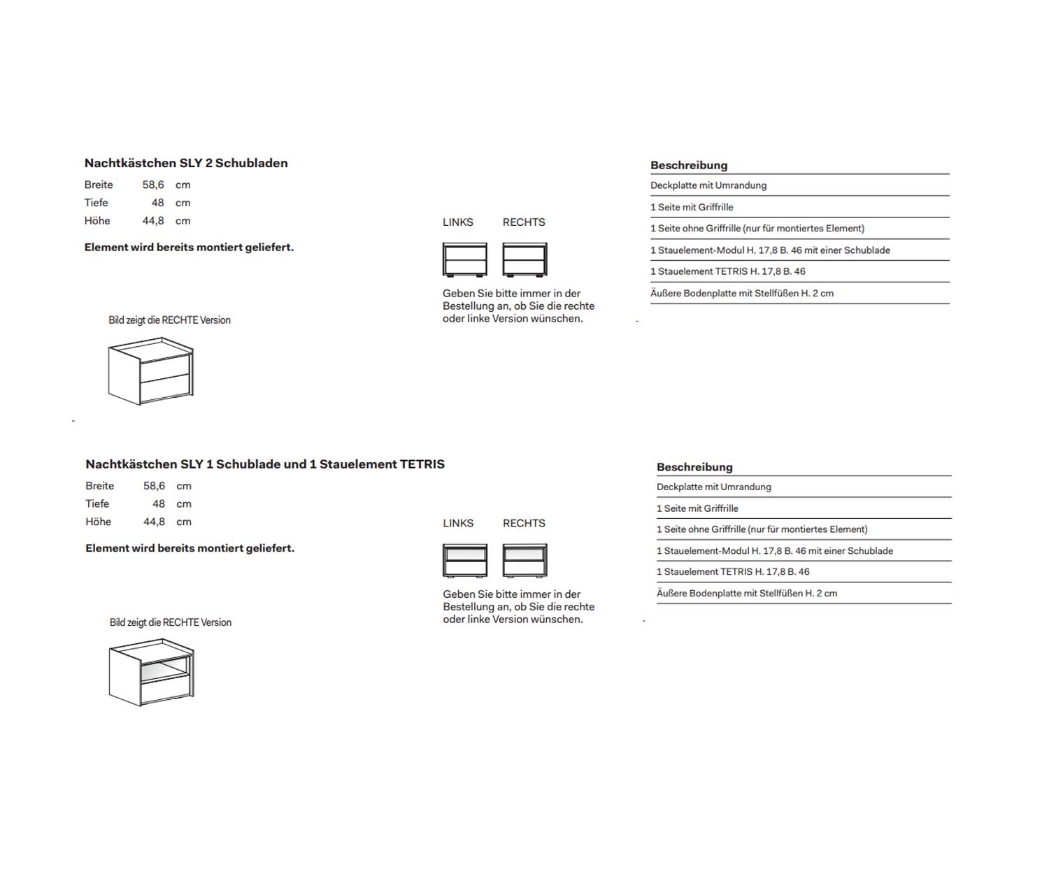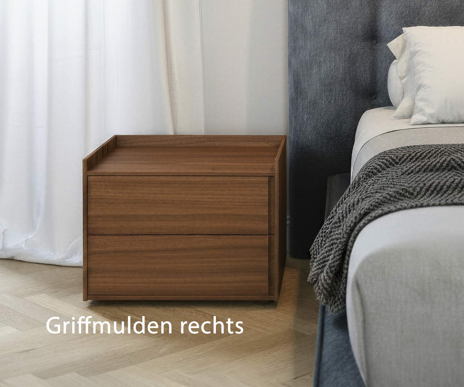 Les tiroirs de la table de nuit Sly disposent de glissières de haute qualité avec fermeture automatique (technique Soft-Close). Les tiroirs s'ouvrent à l'aide de poignées encastrées. Vous pouvez choisir le modèle latéral des poignées encastrées pour le côté du lit correspondant dans le configurateur.