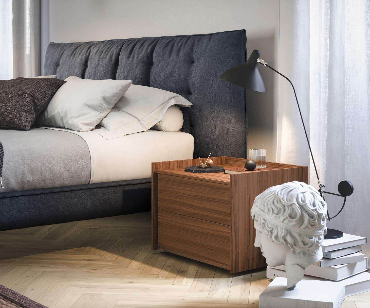La table de chevet Sly est représentée ci-dessus dans le coloris noyer Noce Canaletto N03 plaqué bois.