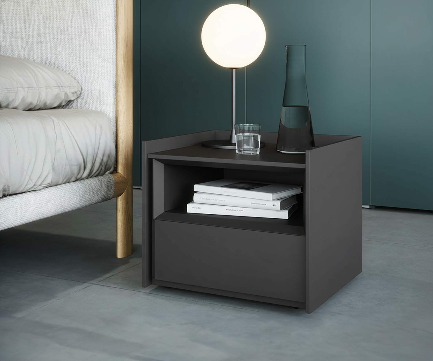 La table de chevet est disponible en 5 coloris mats modernes et 2 plaqués bois. Noir mat (similaire à RAL9017), blanc (similaire à RAL9016), gris clair (similaire à RAL7035), gris foncé (similaire à RAL7022) ou beige (similaire à RAL1019). Ainsi qu'en chêne Rovere Chiaro N04 ou en noyer Noce Canaletto N04.