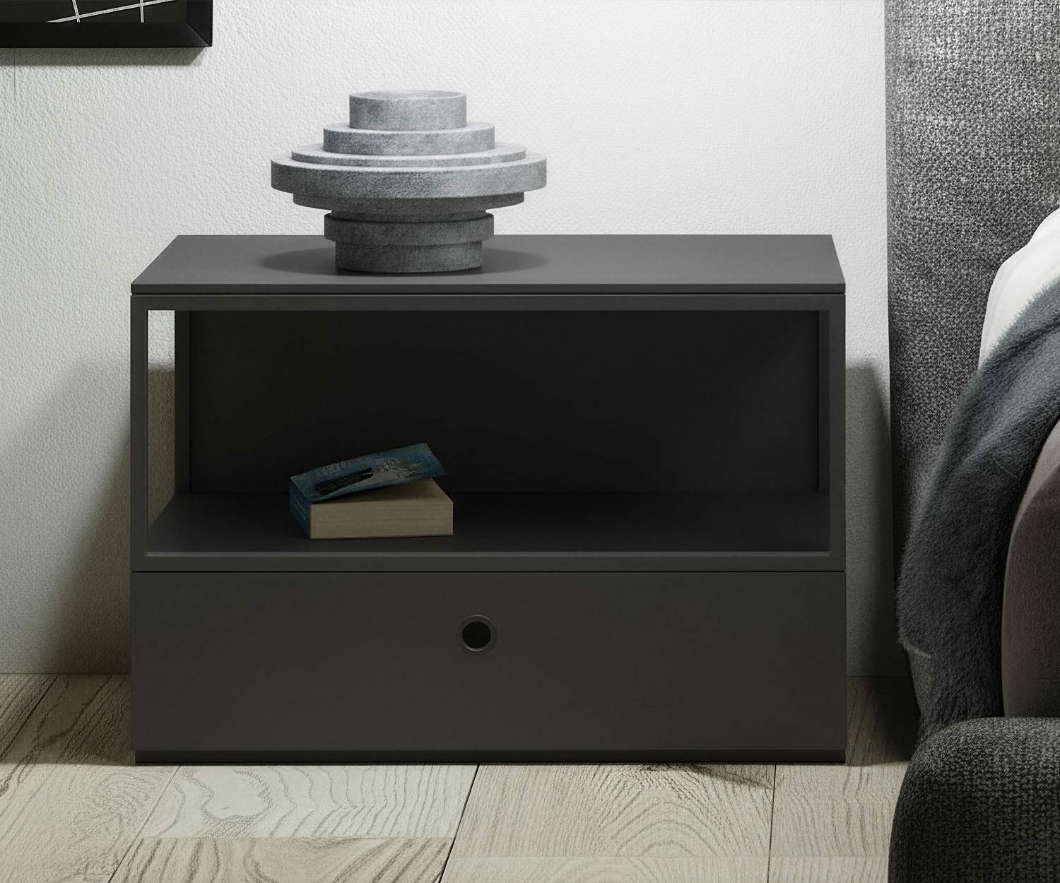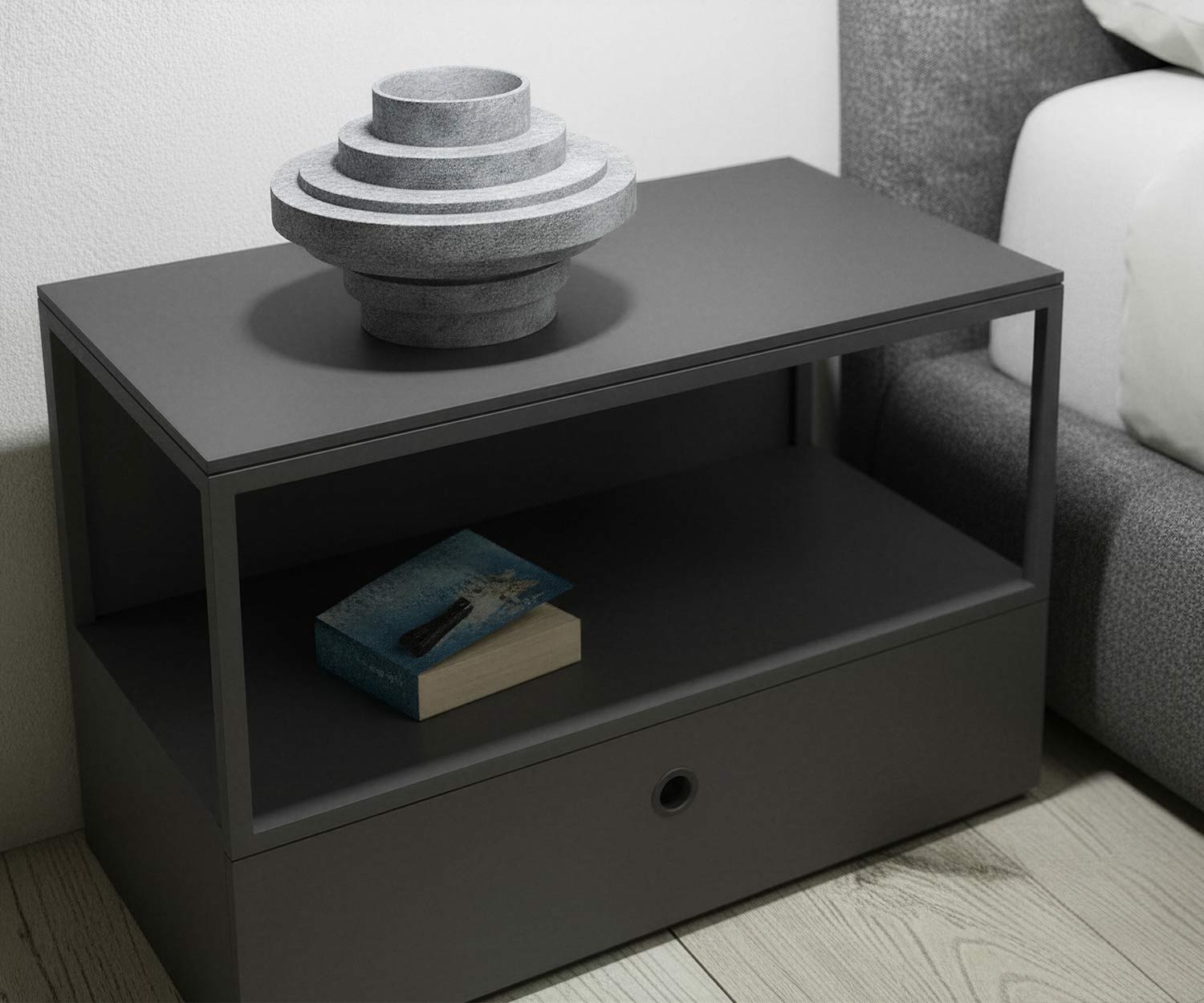 Le corps de la commode de nuit Square de Novamobili est disponible en 5 couleurs mates modernes : Noir mat (similaire à RAL9017), blanc (similaire à RAL9016), gris clair (similaire à RAL7035), gris foncé (similaire à RAL7022) ou beige (similaire à RAL1019).