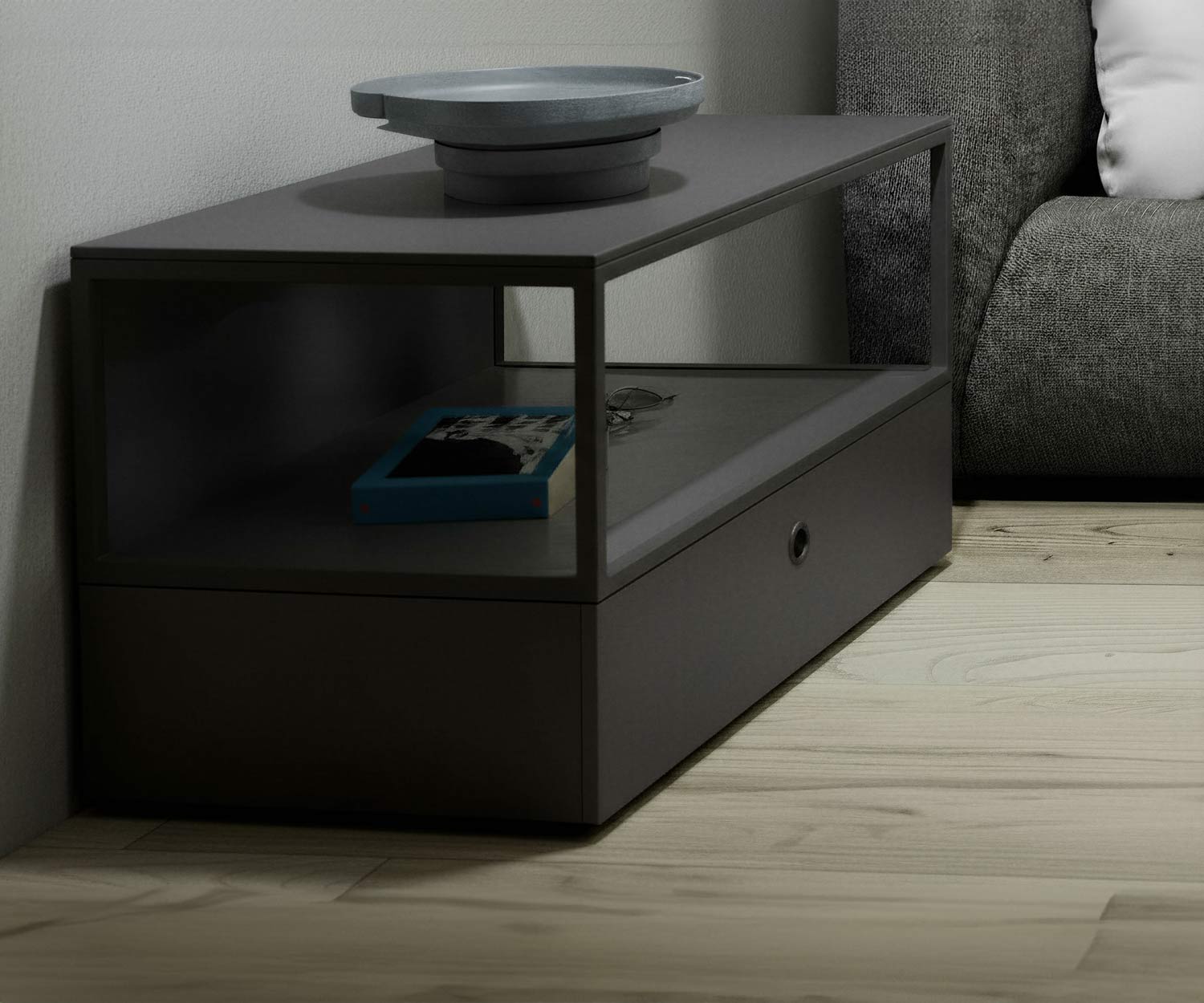 La plaque supérieure, la paroi arrière et la plaque inférieure de l'élément de rangement ouvert ainsi que le cadre métallique de l'élément de rangement et les poignées des tiroirs sont disponibles dans la même couleur mate que le corps.