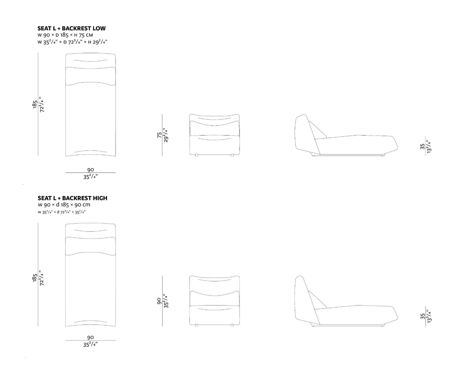 B 90 cm / H 75 cm / T 185 cm als Sofa Liege mit Rückenlehne niedrig