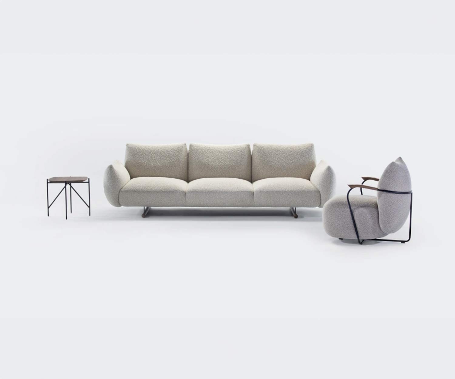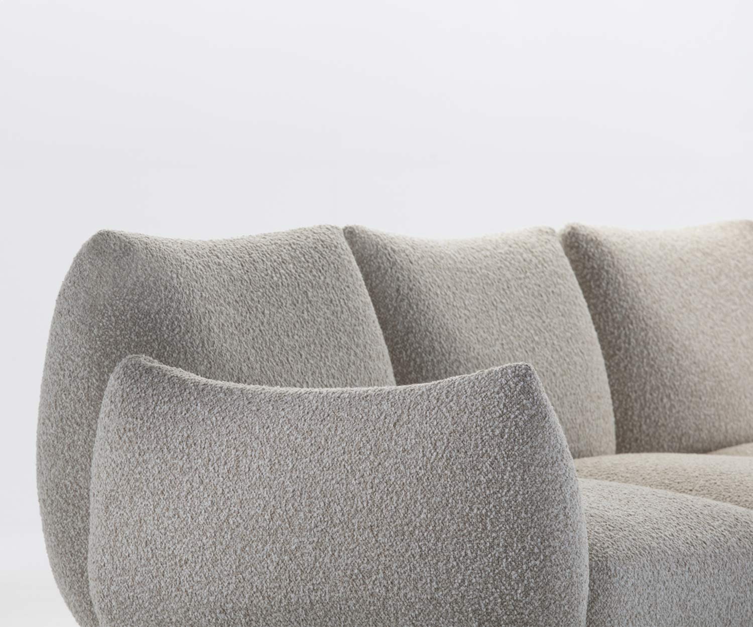Le tissu de revêtement du canapé design Prostoria Buffa est disponible en 3 couleurs: bouclé beige, gris clairou gris foncé. Le canapé Buffa est disponible en deux variantes: en 2 places et en 3 places, chacune avec l'option d'un accoudoir pour un confort supplémentaire.