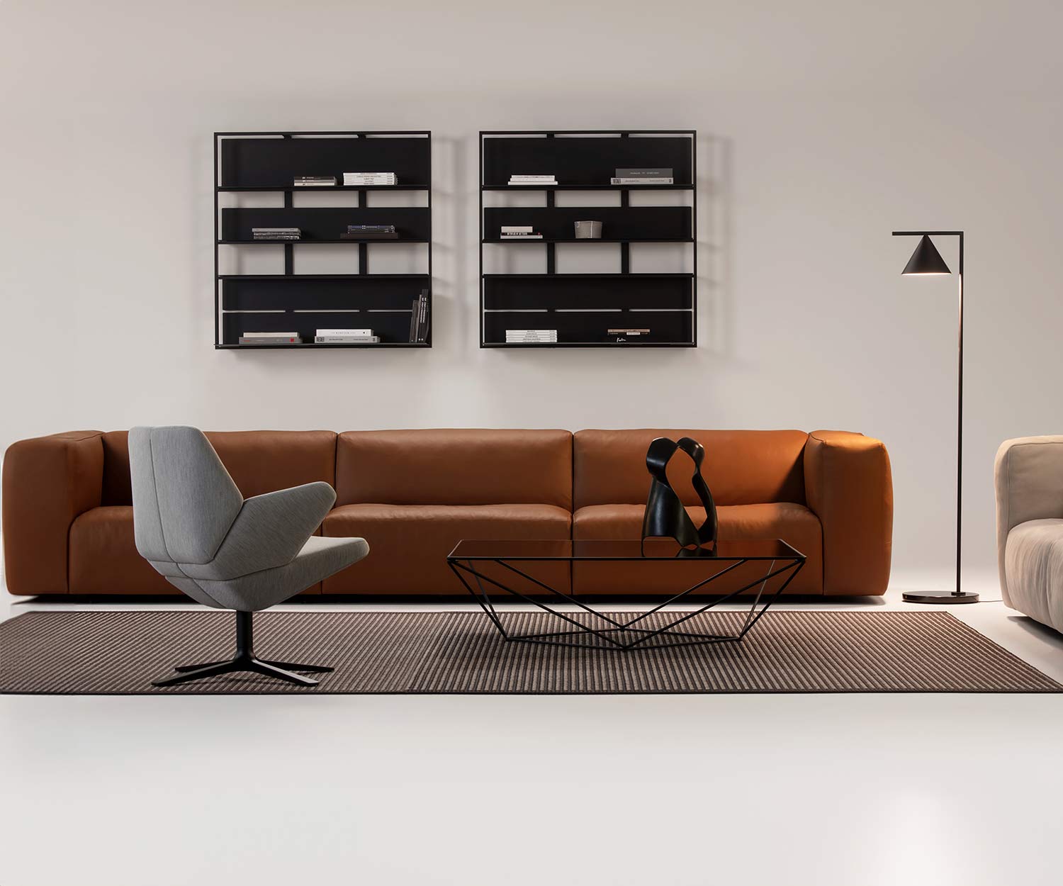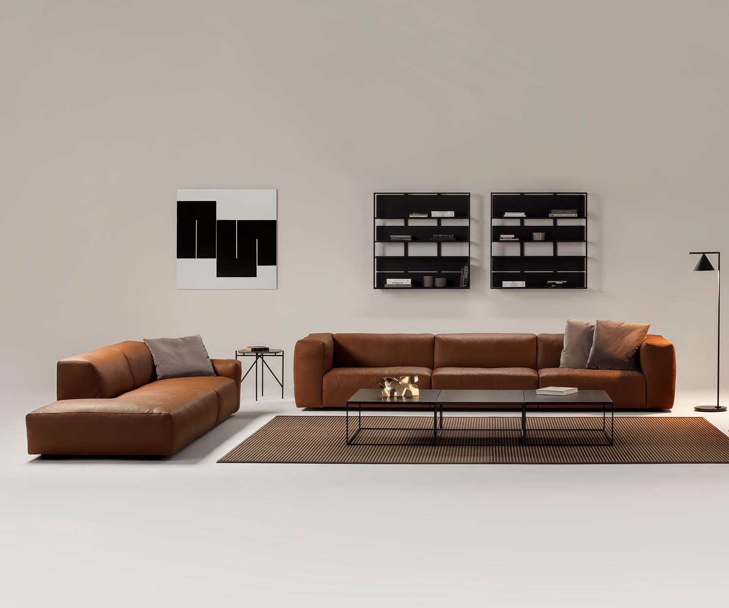 Sur toutes les photos, le canapé est présenté en cuir Divina de couleur cognac ou en tissu Tundra de couleur gris foncé.