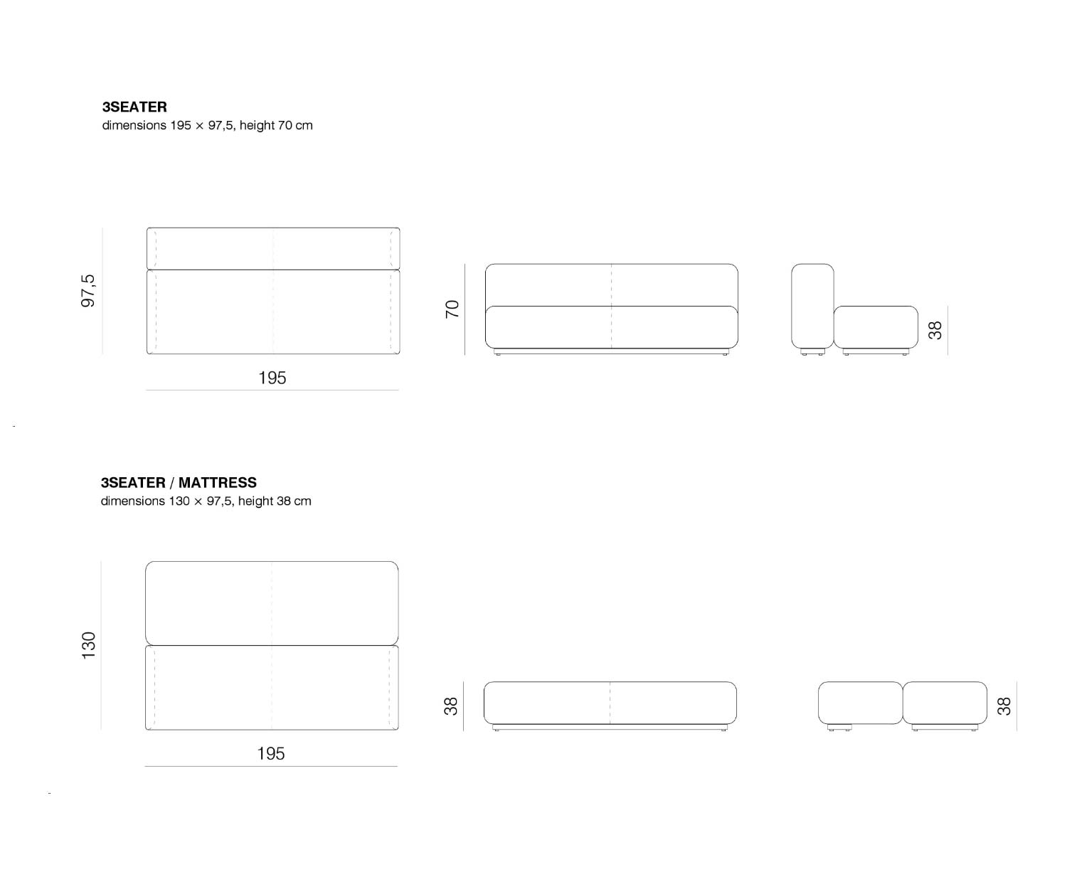 L 195 cm / H 70 cm / P 97,5 cmen tant que canapé 3 places