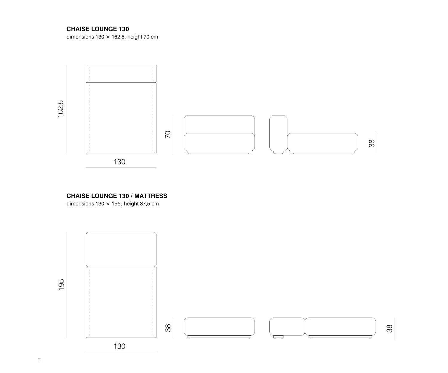 L 130 cm / H 70 cm / P 162,5 cm comme Chaise Lounge