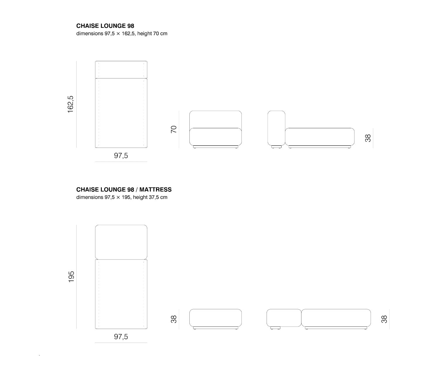 L 97,5 cm / H 70 cm / P 162,5 cm comme chaise longue
