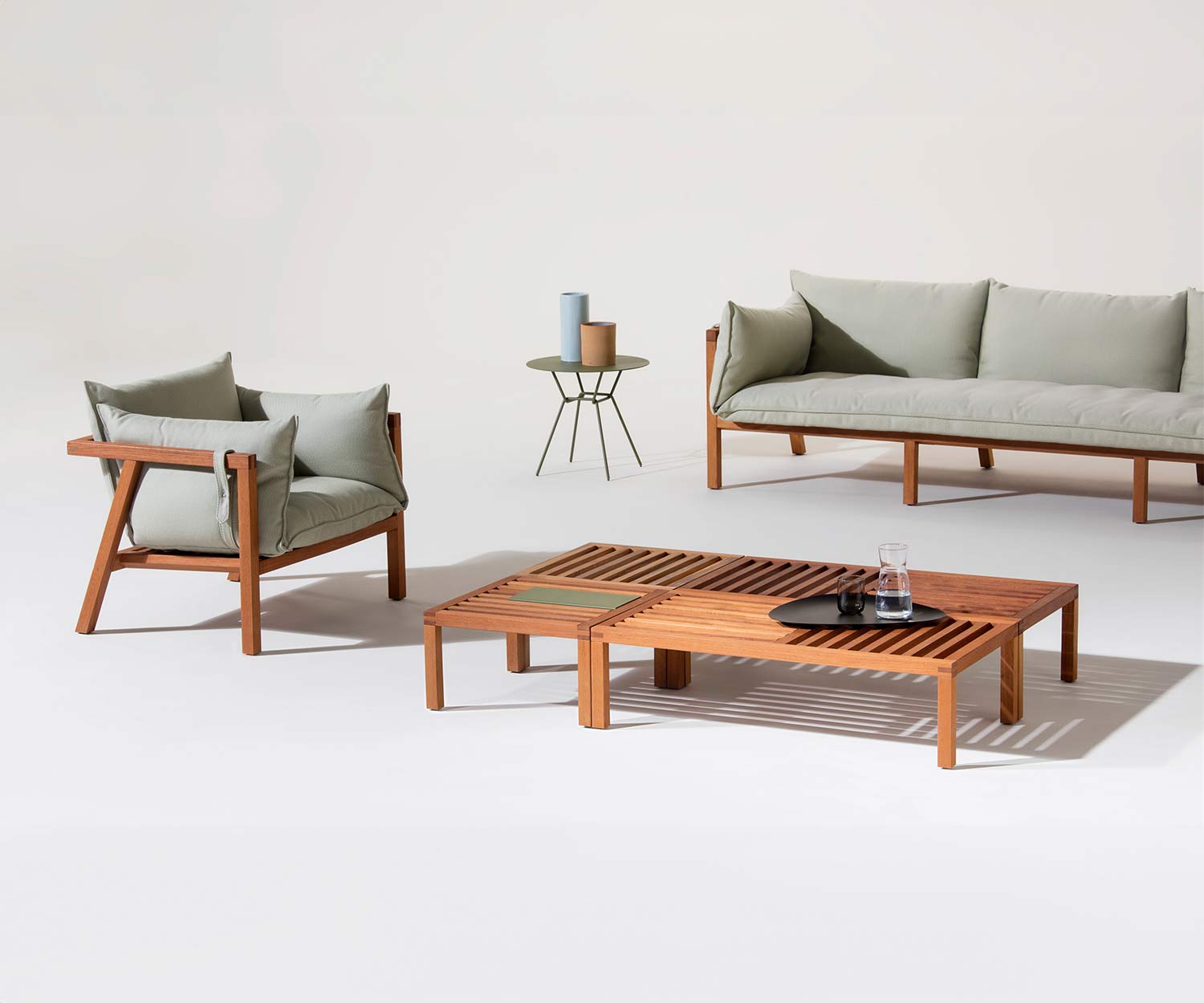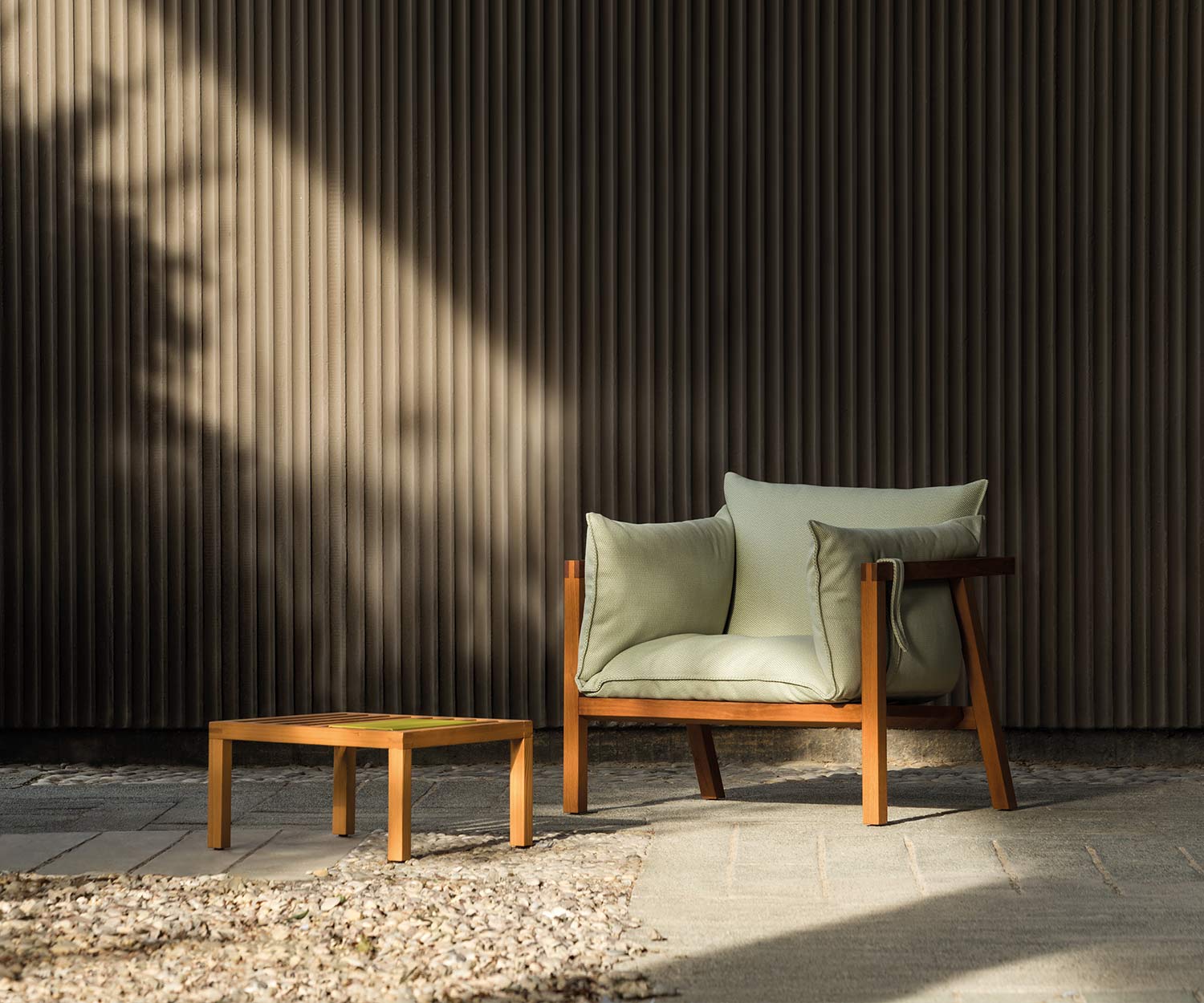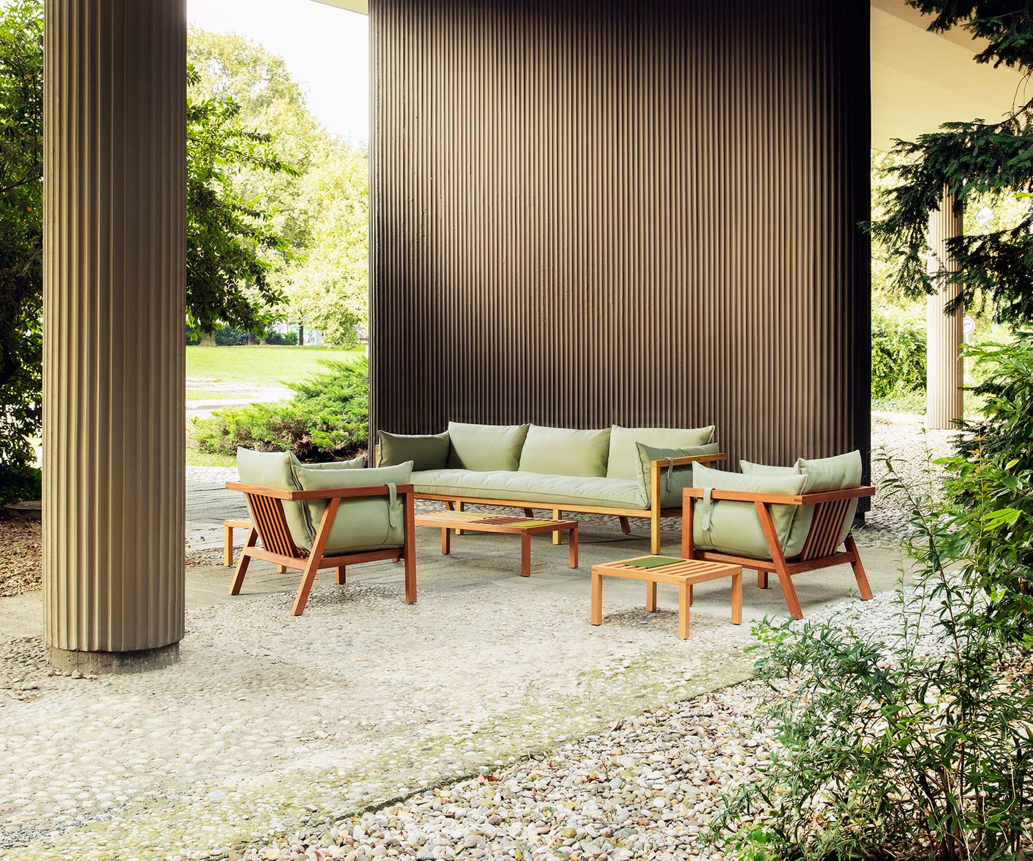 Les fauteuils, canapés et chaises longues d'extérieur Umomoku sont disponibles en teck naturel et sont résistants à l'eau. Les coussins d'assise et de dossier sont disponibles en vert clair (tissu indoor) et en gris clair ou blanc écru (tissu outdoor imperméable).