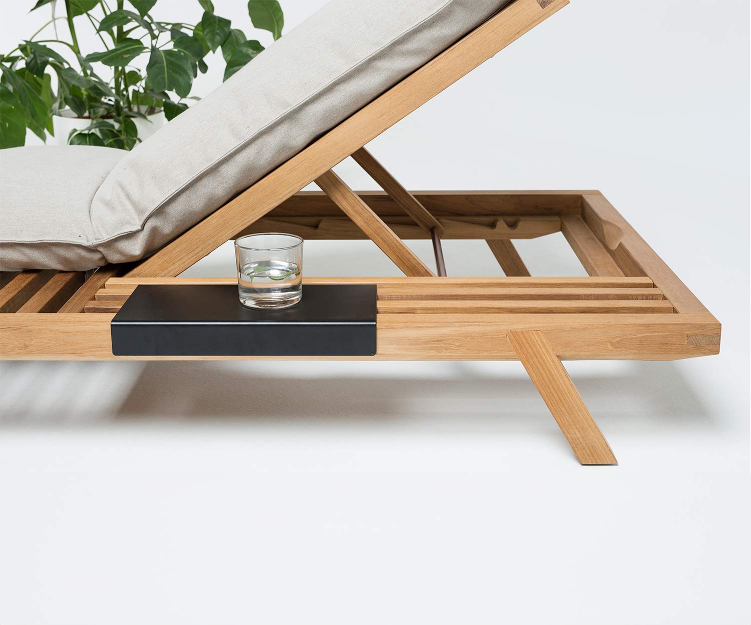 Les meubles Umomoku Outdoor de haute qualité conviennent aussi bien pour l'intérieur que pour l'extérieur. Les coussins rembourrés sont amovibles pour le nettoyage. La chaise longue est particulièrement fonctionnelle, car le dossier s'ouvre des deux côtés. À côté de la tête de lit se trouve une extension en lattes de bois pour poser des boissons et des friandises.