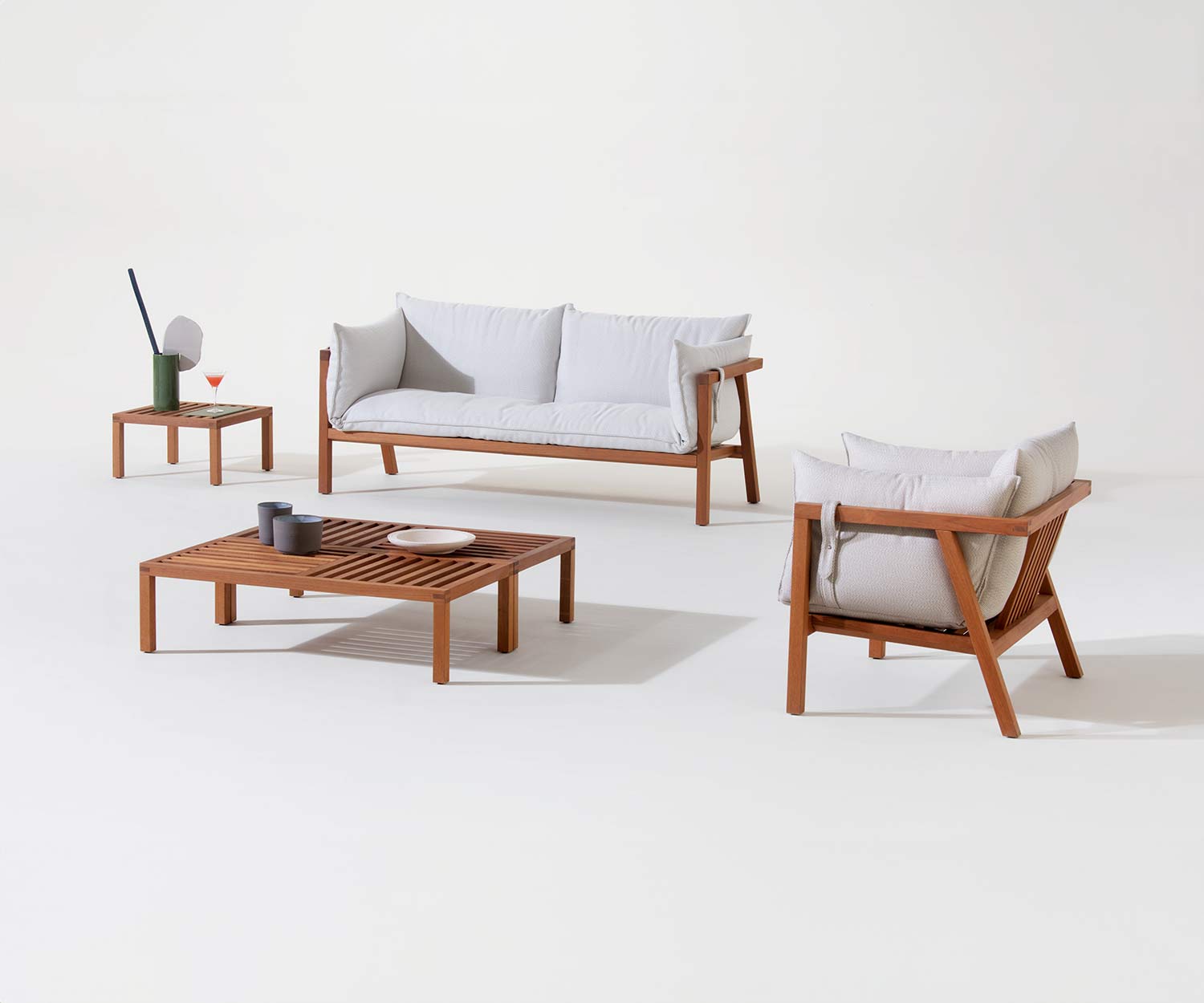 La collection Prostoria Umomoku Outdoor se compose de fauteuils, de canapés 2 places et 3 places et d'un bain de soleil. La série exclusive Outdoor transforme votre jardin en une oasis de détente. Avec leur design en bois de qualité supérieure en teck résistant aux intempéries et leurs coussins confortables, les sièges et les chaises longues d'