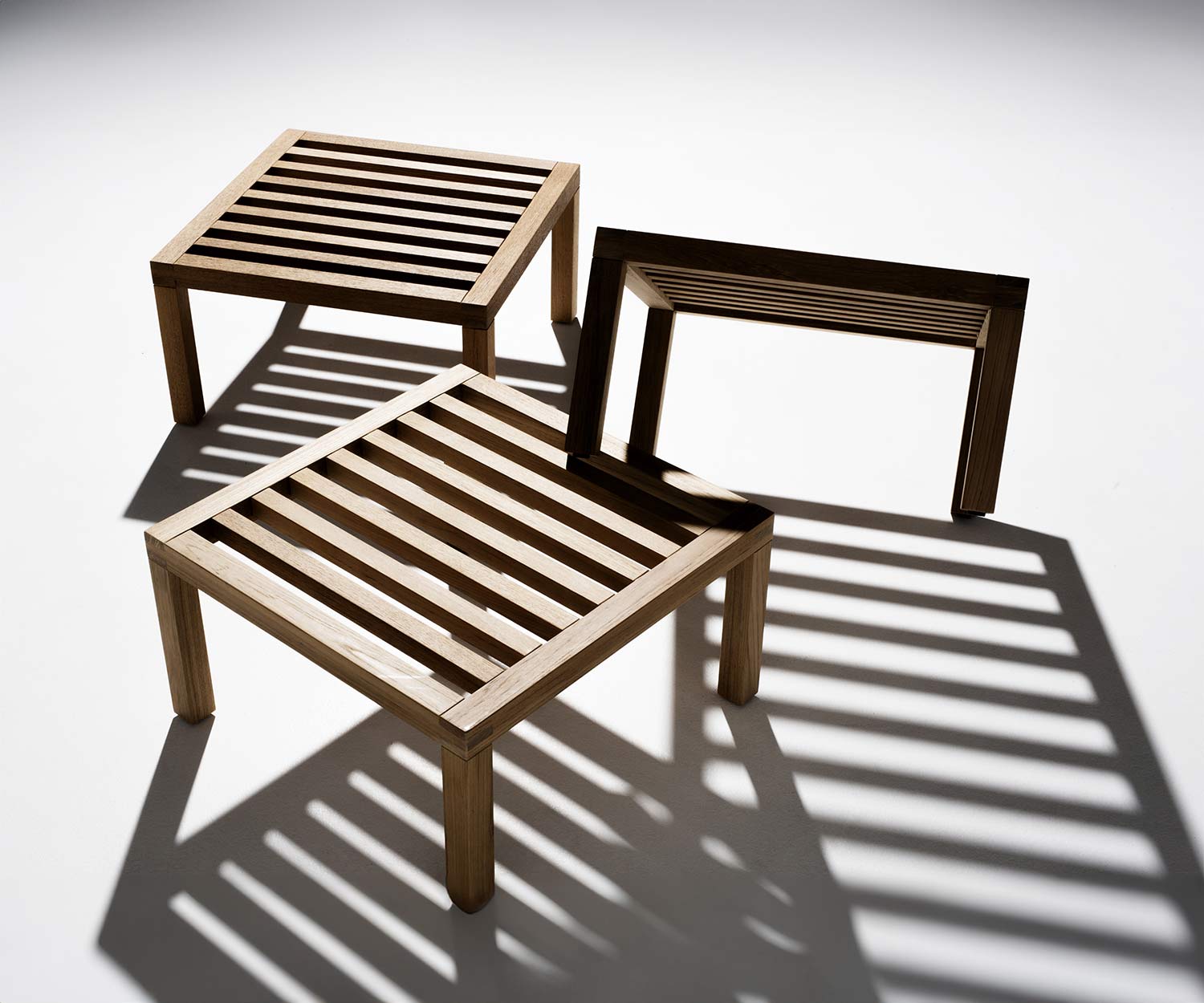 Les tables de jardin Umomoku Outdoor sont disponibles en teck naturel et sont résistantes à l'eau.