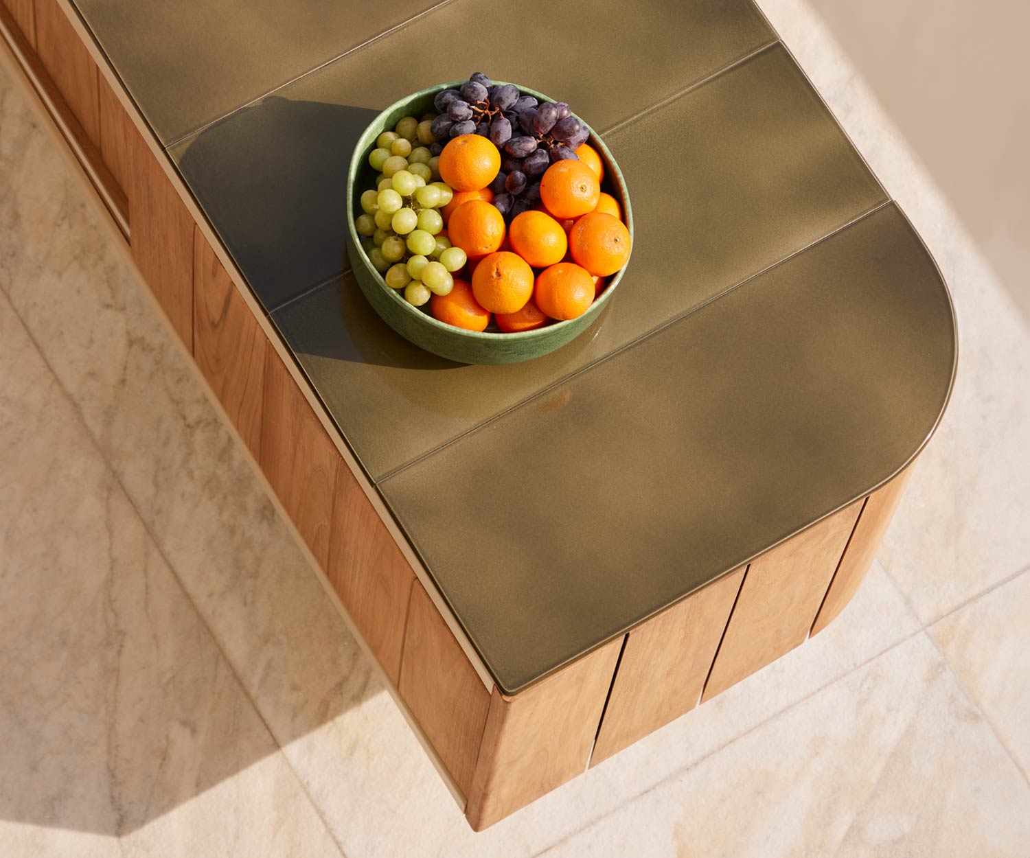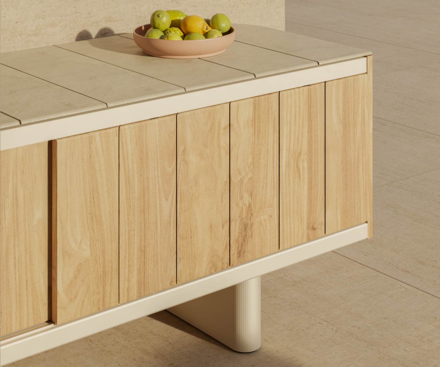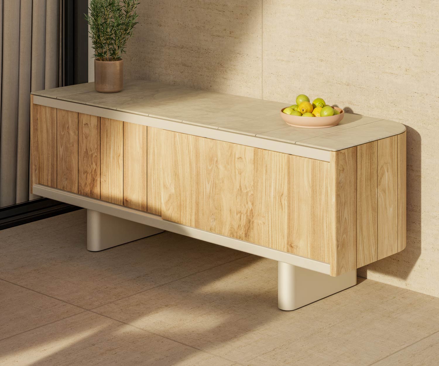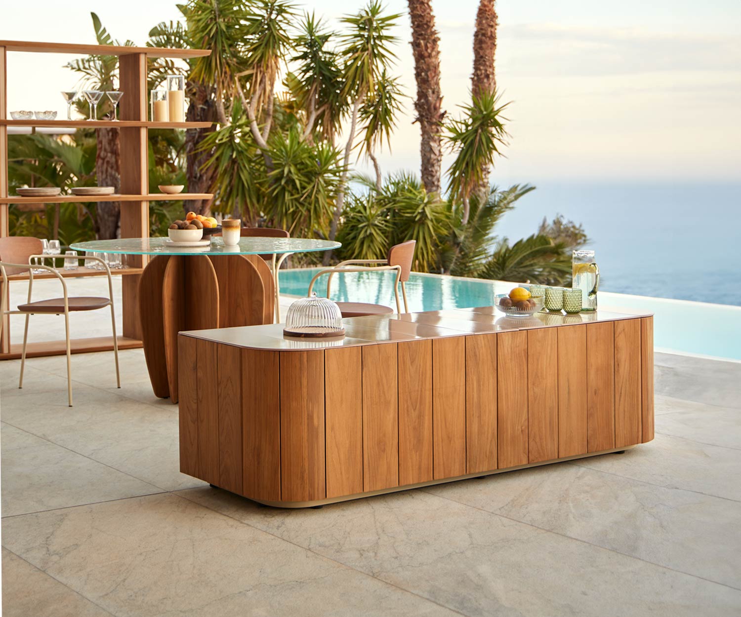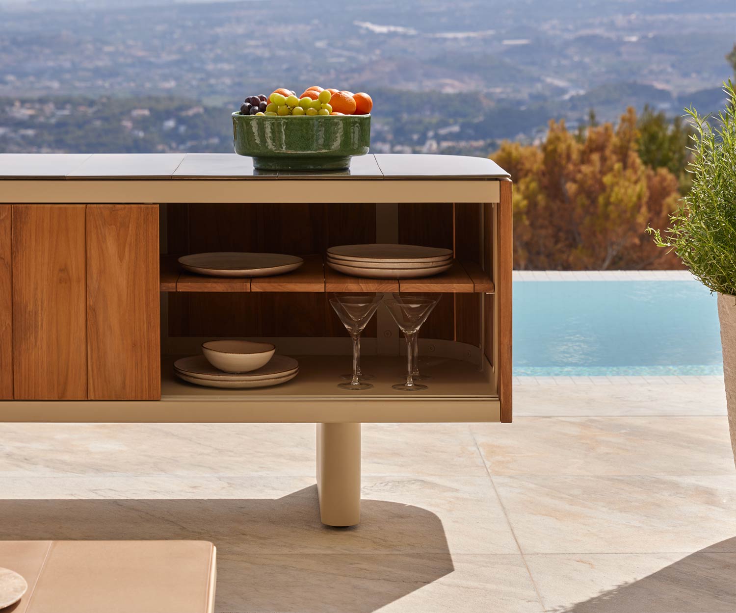 Avec ses nouveaux matériaux - la combinaison de céramique de haute qualité et de teck - le sideboard Atrio Outdoor offre une ambiance