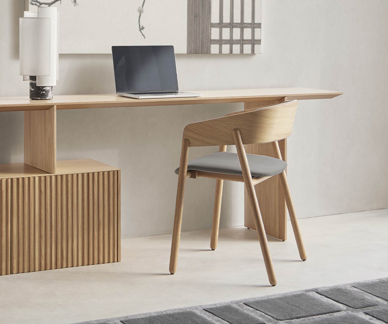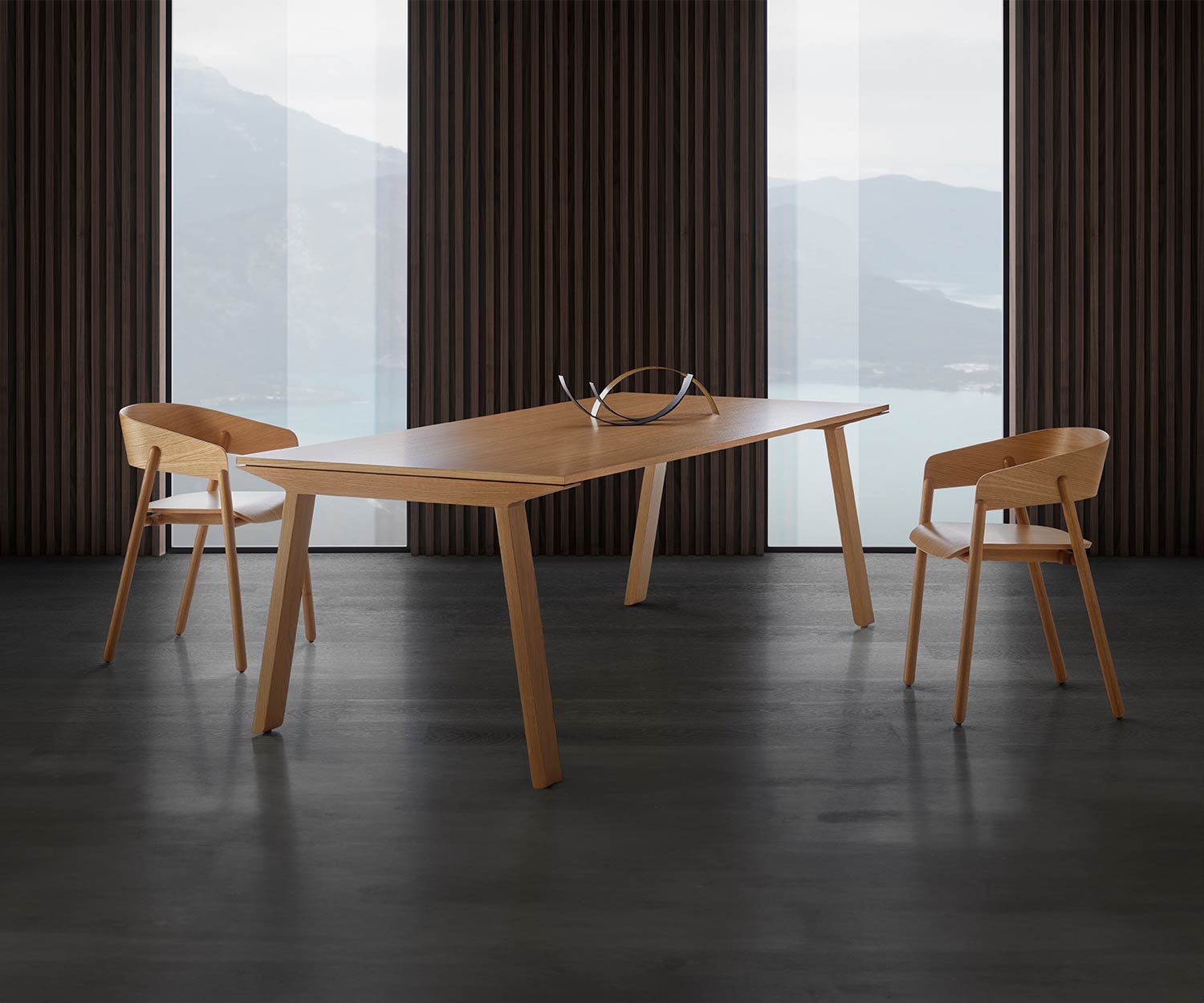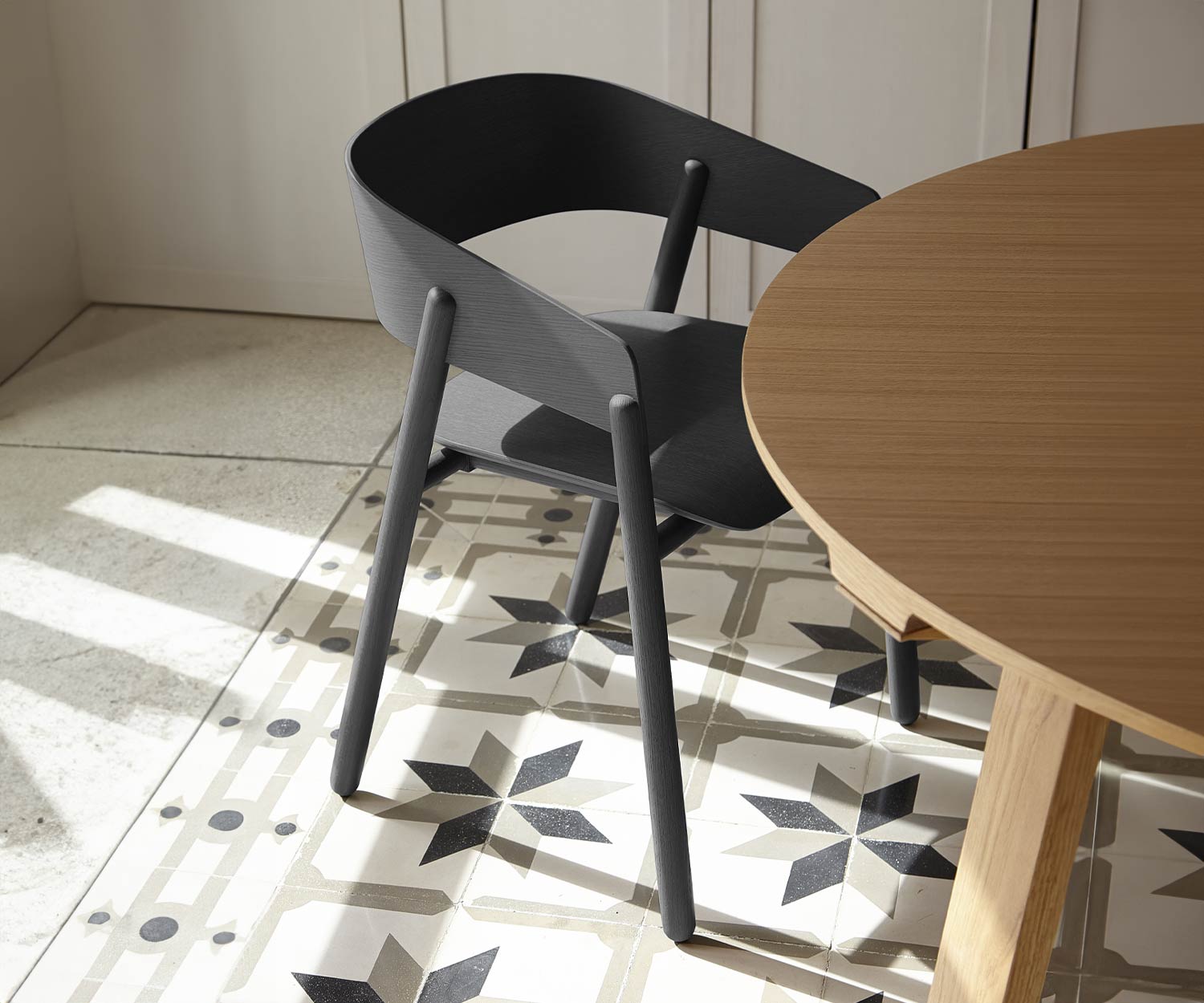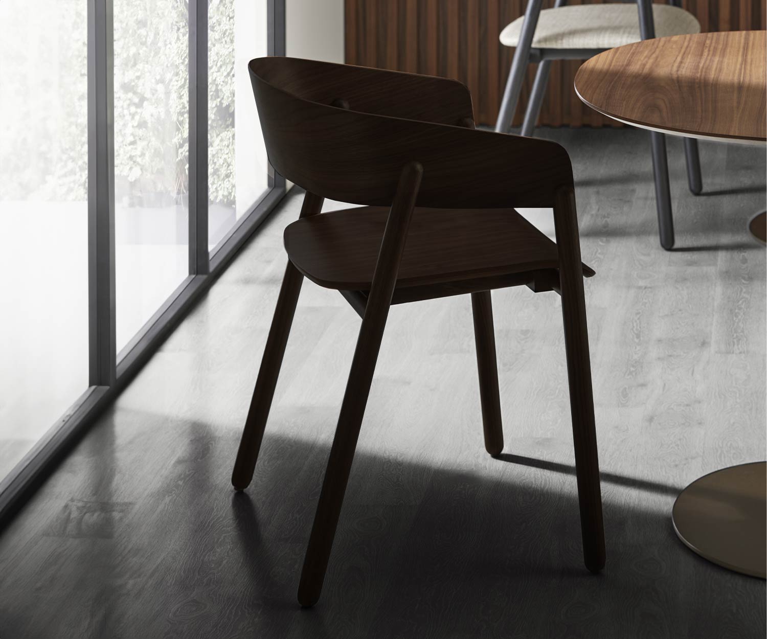 La chaise design Mava de Punt est fabriquée pour vous en Espagne, uniquement sur commande. La production se fait à la main. Le piètement est en chêne ou en noyer massif. L'assise et le dossier sont en bois stratifié moulé avec un placage en bois véritable en noyer ou en chêne. Les pieds ont des patins en feutre intégrés.