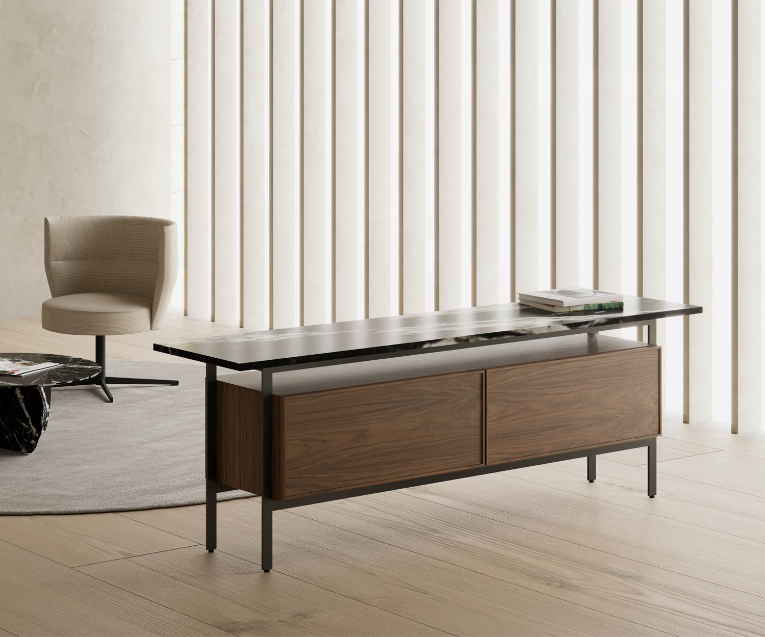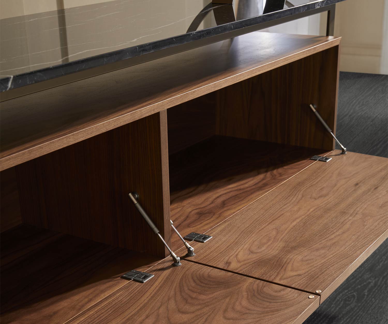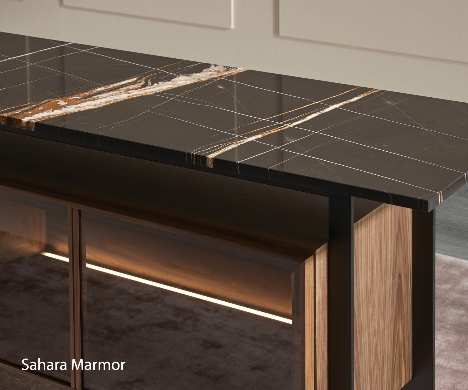 Le corps est composé de panneaux MDF de classe E1, revêtus d'un placage en noyer. sont ennoblis d'un noble placage en noyer. Le plateau de finition est fabriqué dans un marbre de qualité supérieure. Les cadres métalliques et les Les châssis sont en acier. Les portes sont en verre ou en noyer. sont réalisées.