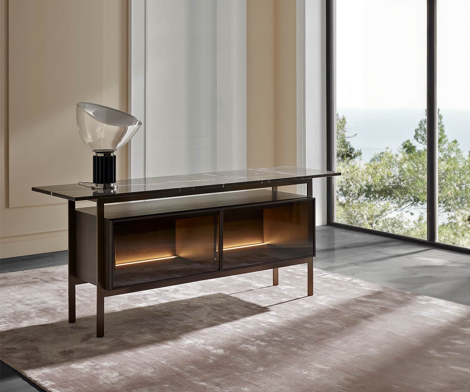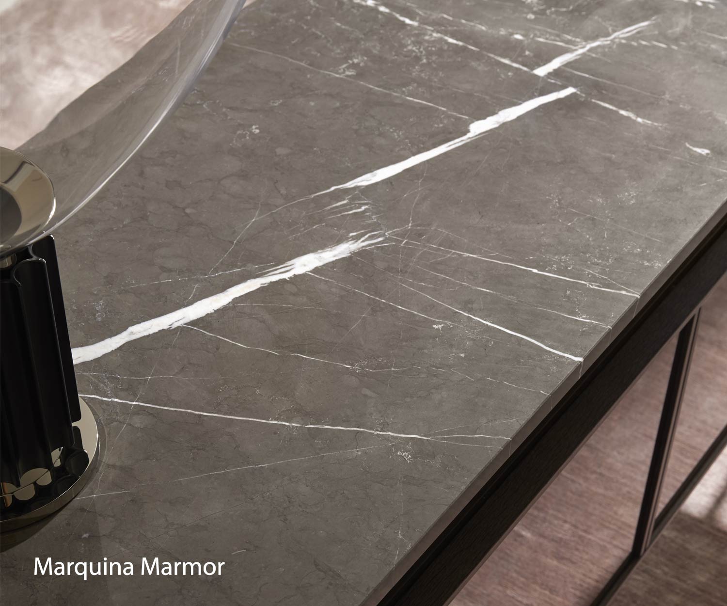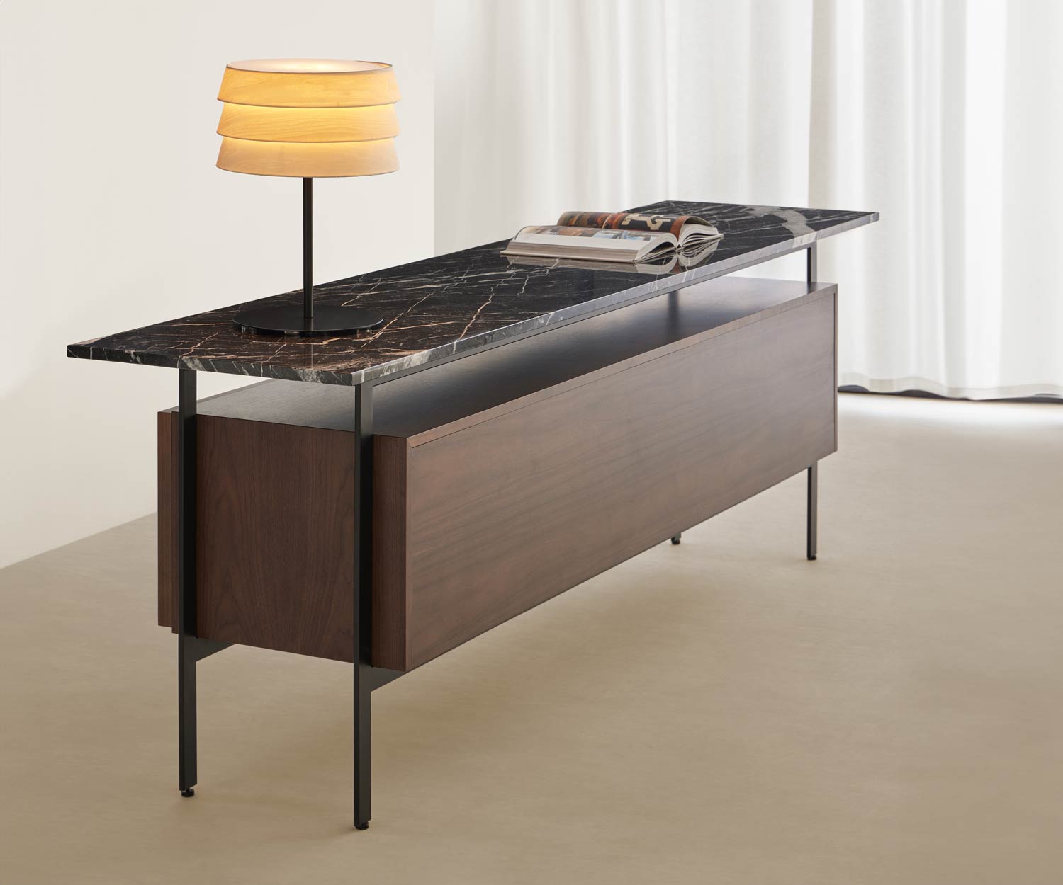 Le corps est composé de panneaux MDF de classe E1, revêtus d'un placage en noyer. sont ennoblis d'un noble placage en noyer. Le plateau de finition est fabriqué dans un marbre de qualité supérieure. Les cadres métalliques et les Les châssis sont en acier. Les portes sont en verre ou en noyer. sont réalisées.