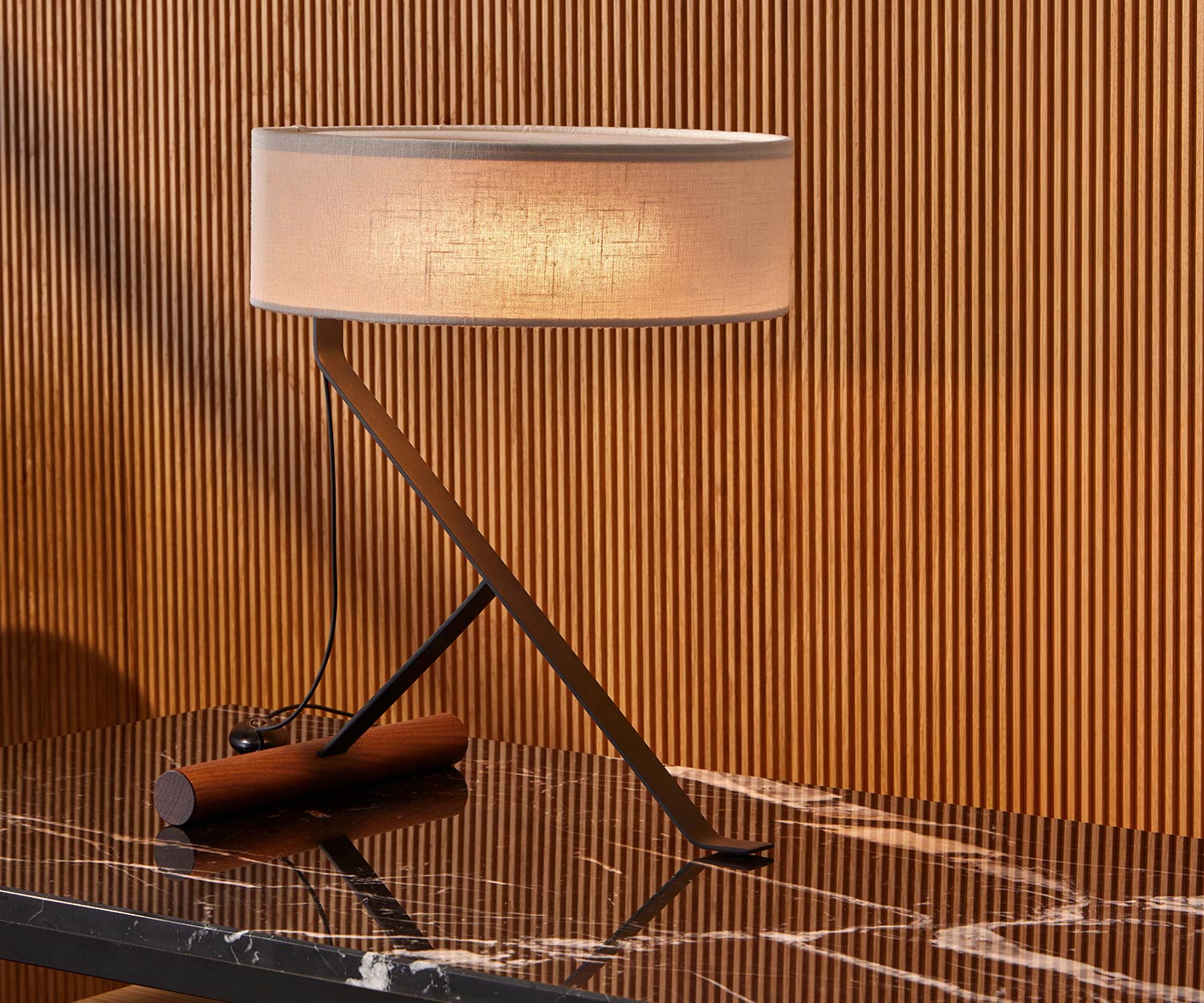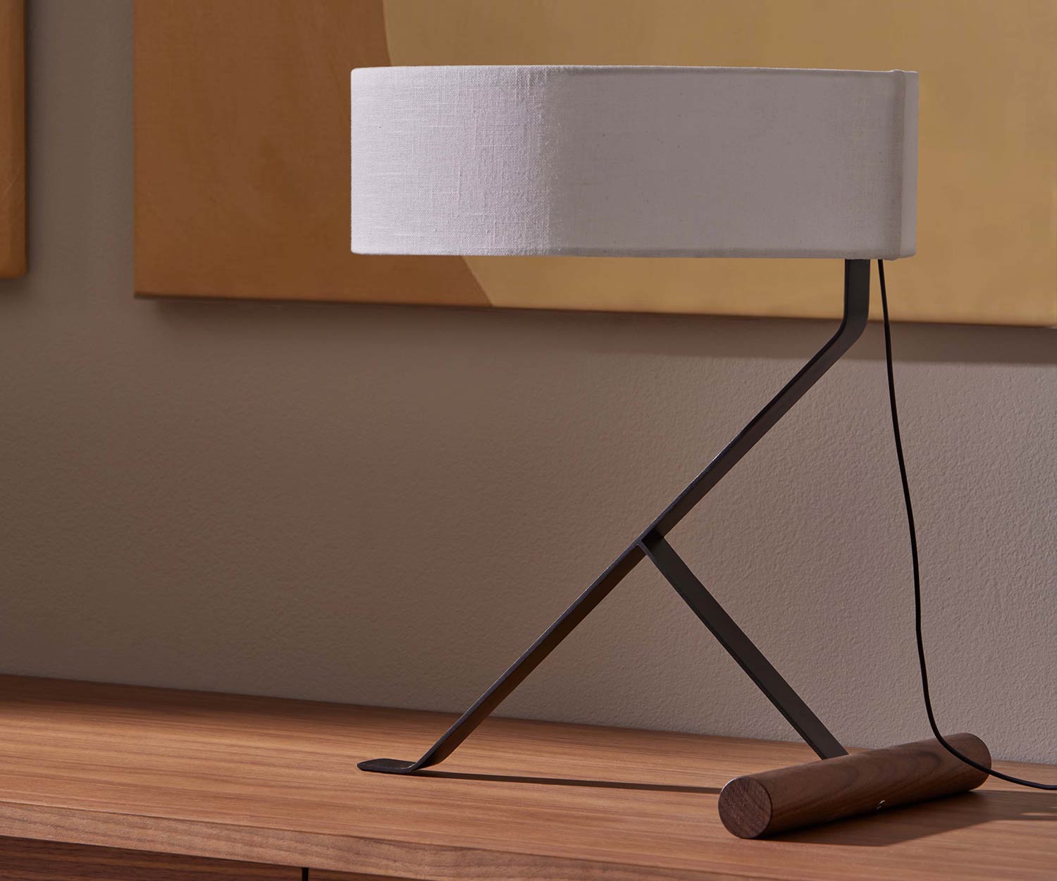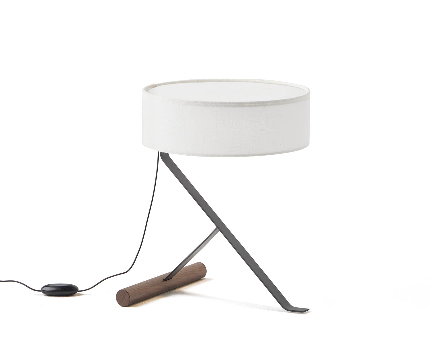 L'abat-jour de la lampe de table Punt Chicago est recouvert de coton naturel. La structure est en métal nickel noir et le pied est en noyer super mat.