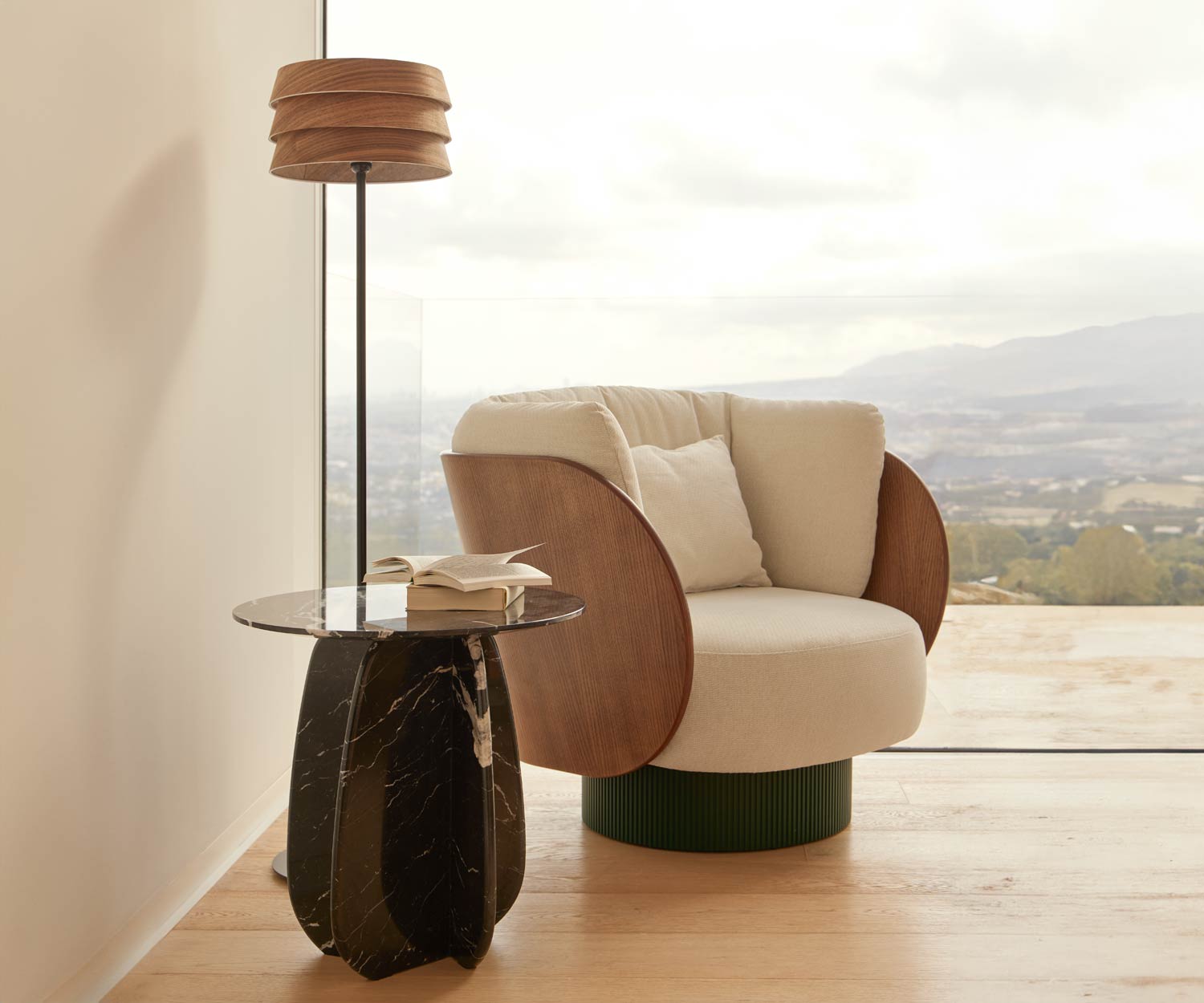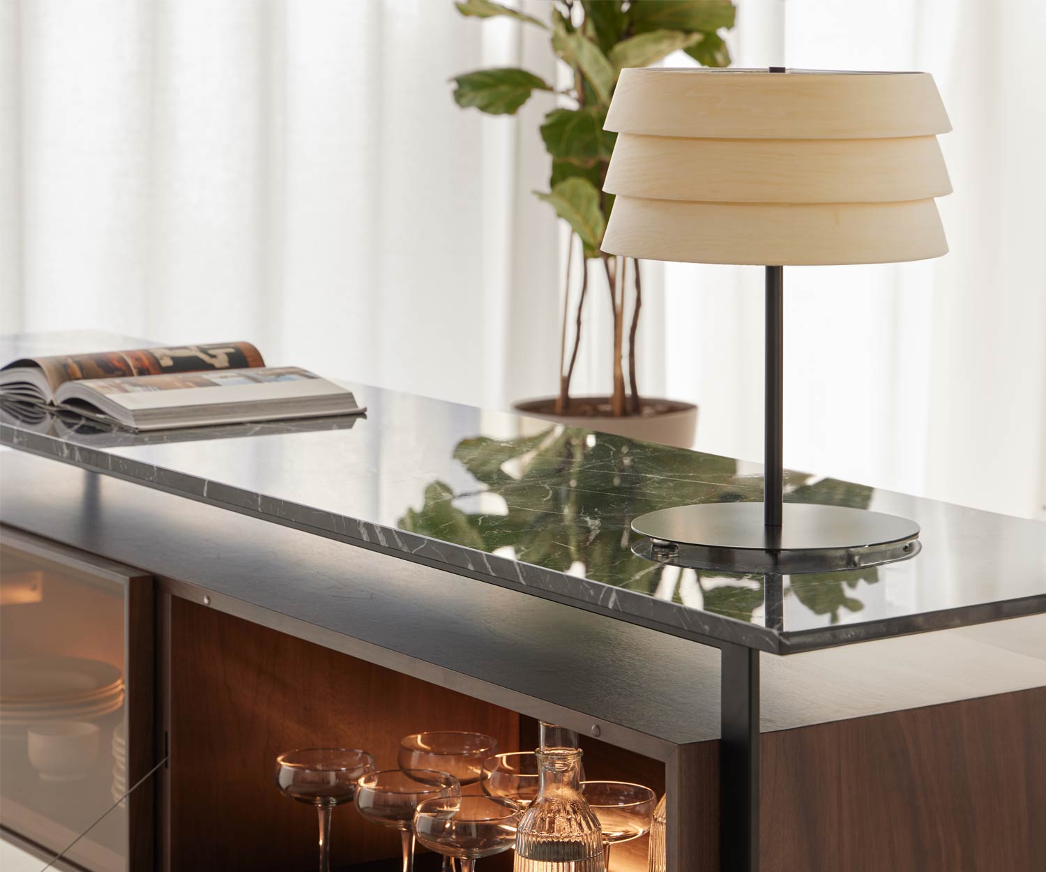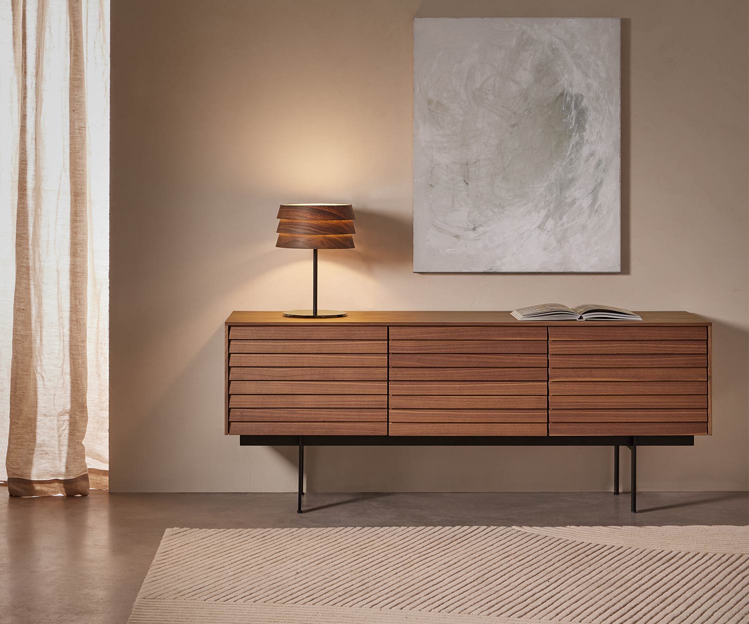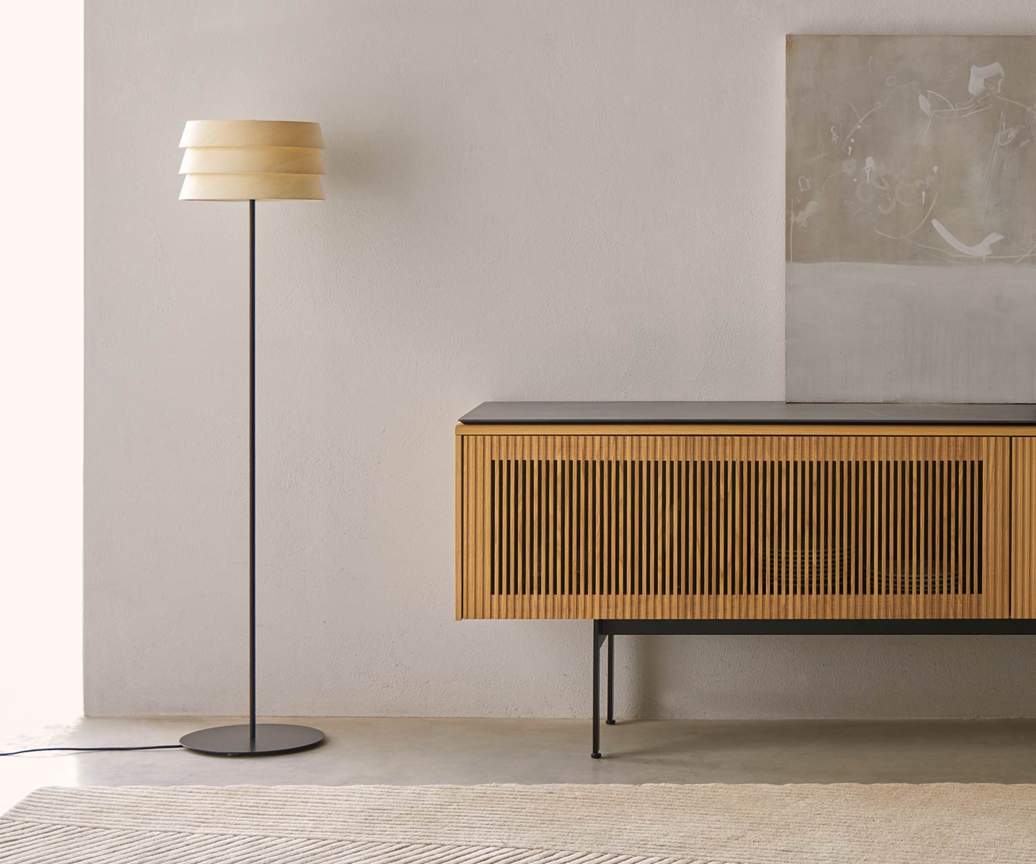 Le noyer foncé mat ou le placage de frêne clair sont des matériaux classiques et intemporels qui s'adaptent à toutes les pièces. Le pied en métal est peint en noir RAL9005 .
