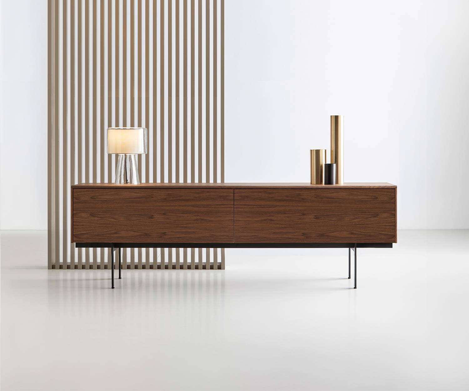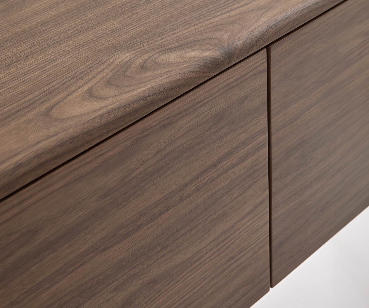 Le corps et les portes du sideboard Punt Malmö sont composés de panneaux MDF E1 et de panneaux de particules E1. Ceux-ci sont plaqués soit avec du noyer, soit avec du chêne. Les panneaux de finition et/ou la façade peuvent être, au choix, en aluminium anodisé, en verre laqué ou en laque de couleur métallique. Le corps repose sur un socle en acier avec des pieds revêtus par poudre.